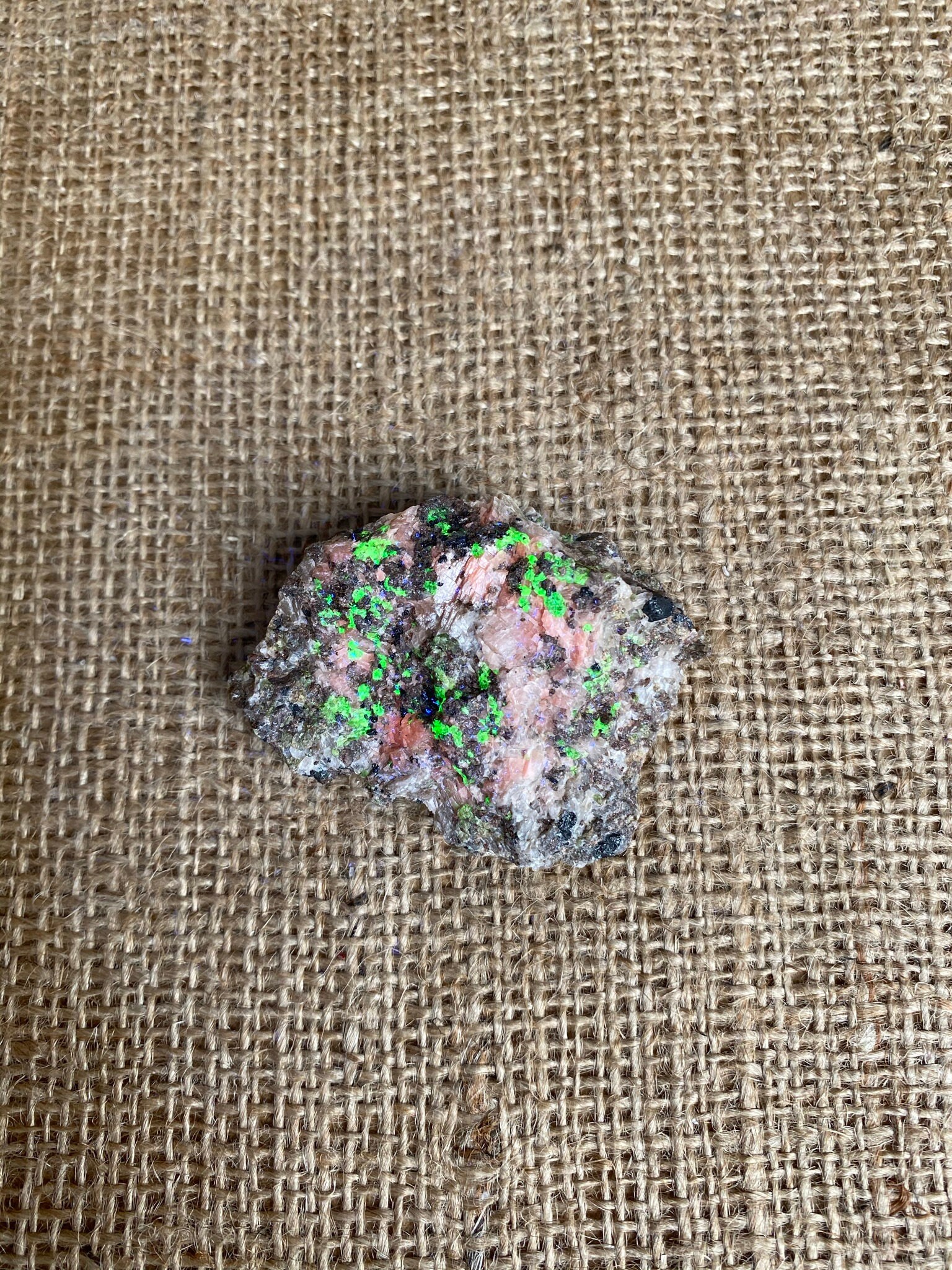 This small specimen contains super bright fluorescent willemite, calcite, garnet and franklinite. It also has a spec of a yellow fluorescing (under LW UV) unidentified mineral.
