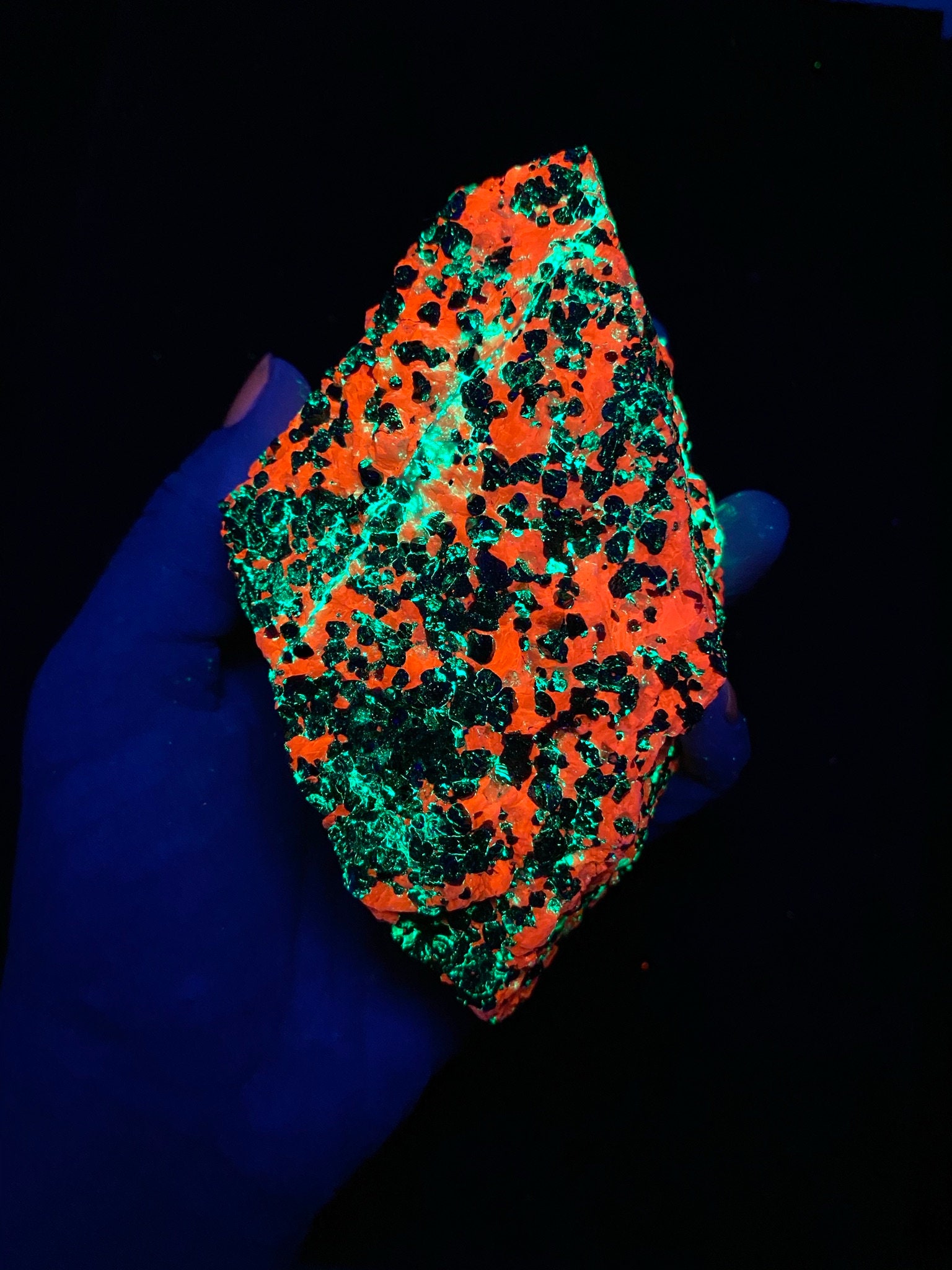 This specimen was photographed using a 36 watt shortwave ultraviolet lamp. The pictures have not been retouched.