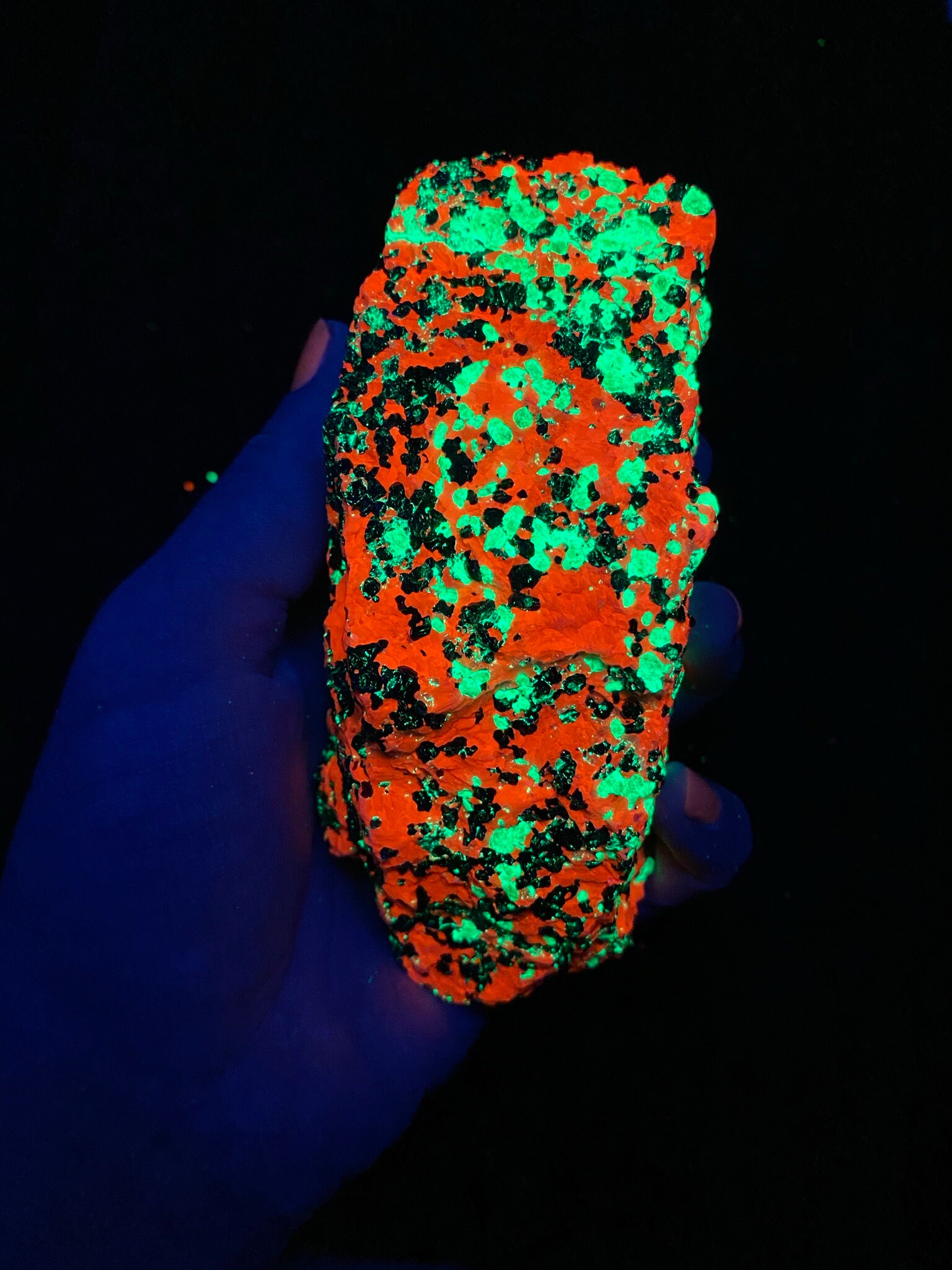 This large specimen contains super bright fluorescent willemite, calcite, zincite and franklinite.