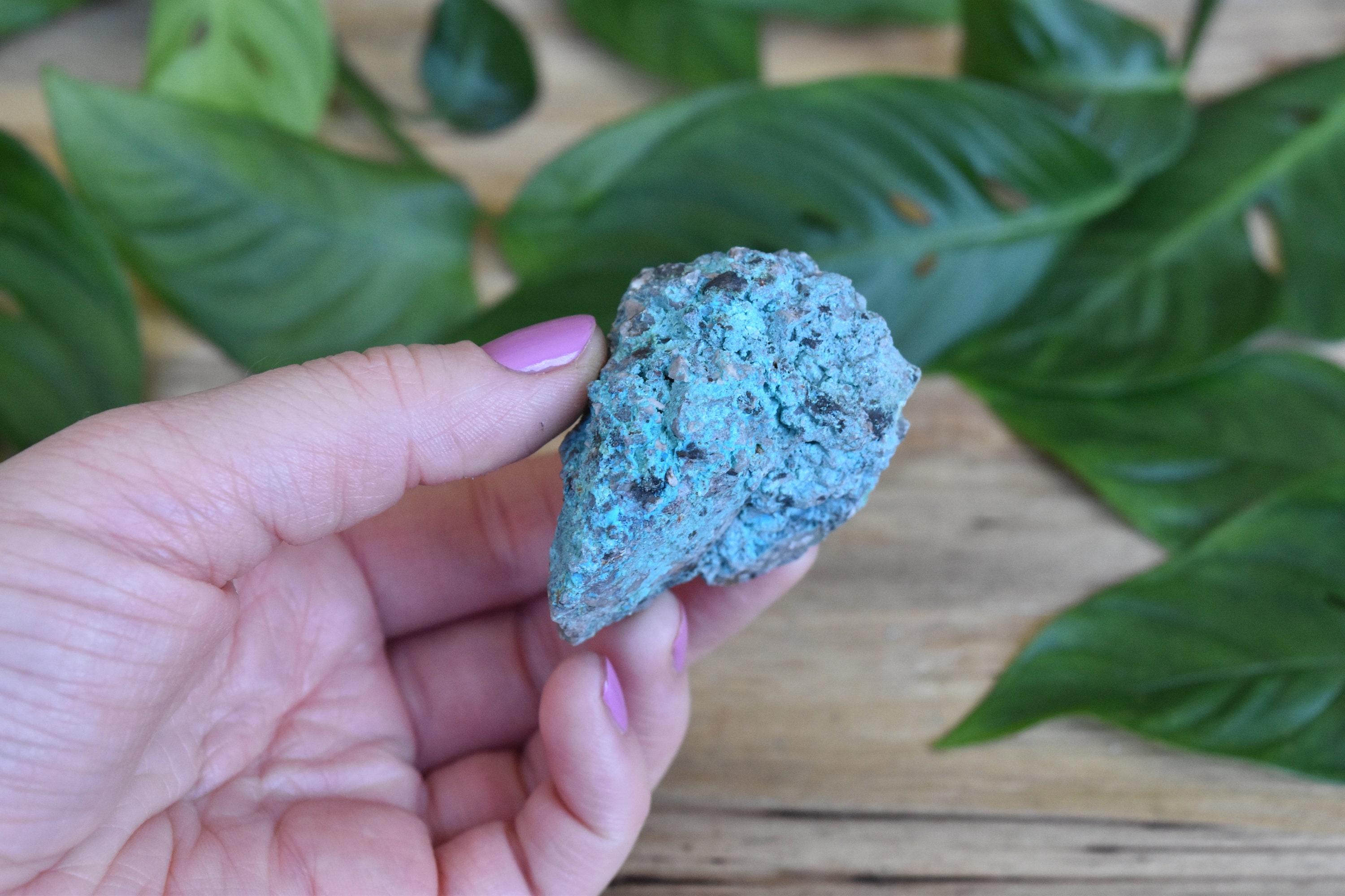 This nice specimen has chrysocolla and some malachite over matrix. This piece has really nice blue and green colors.