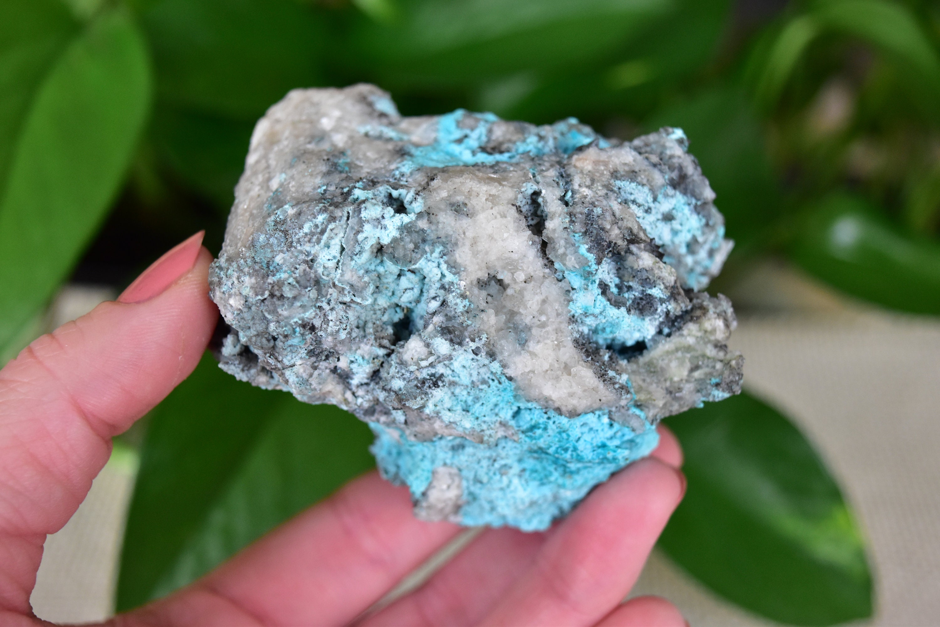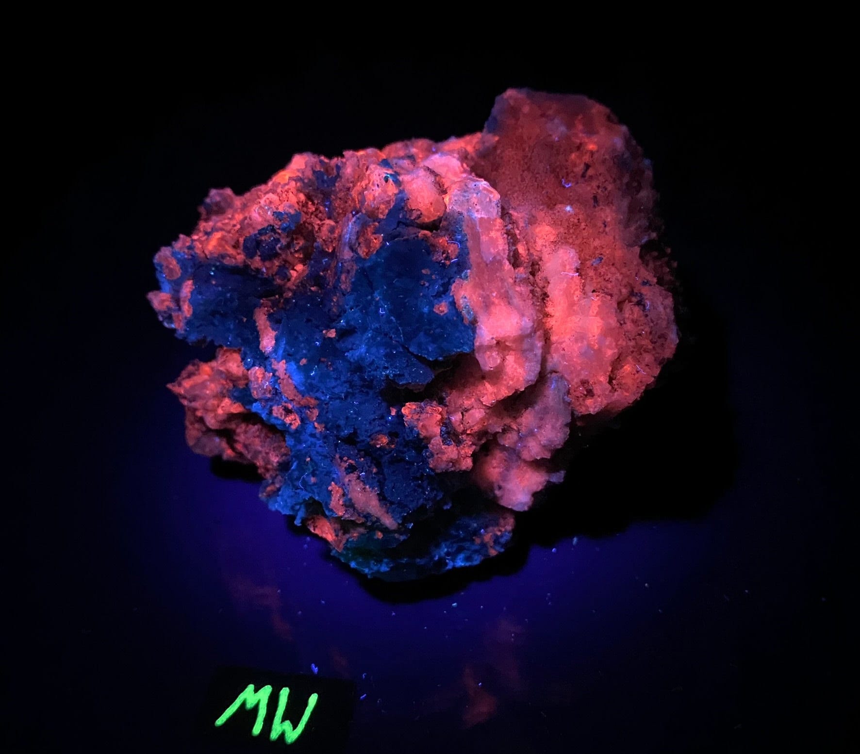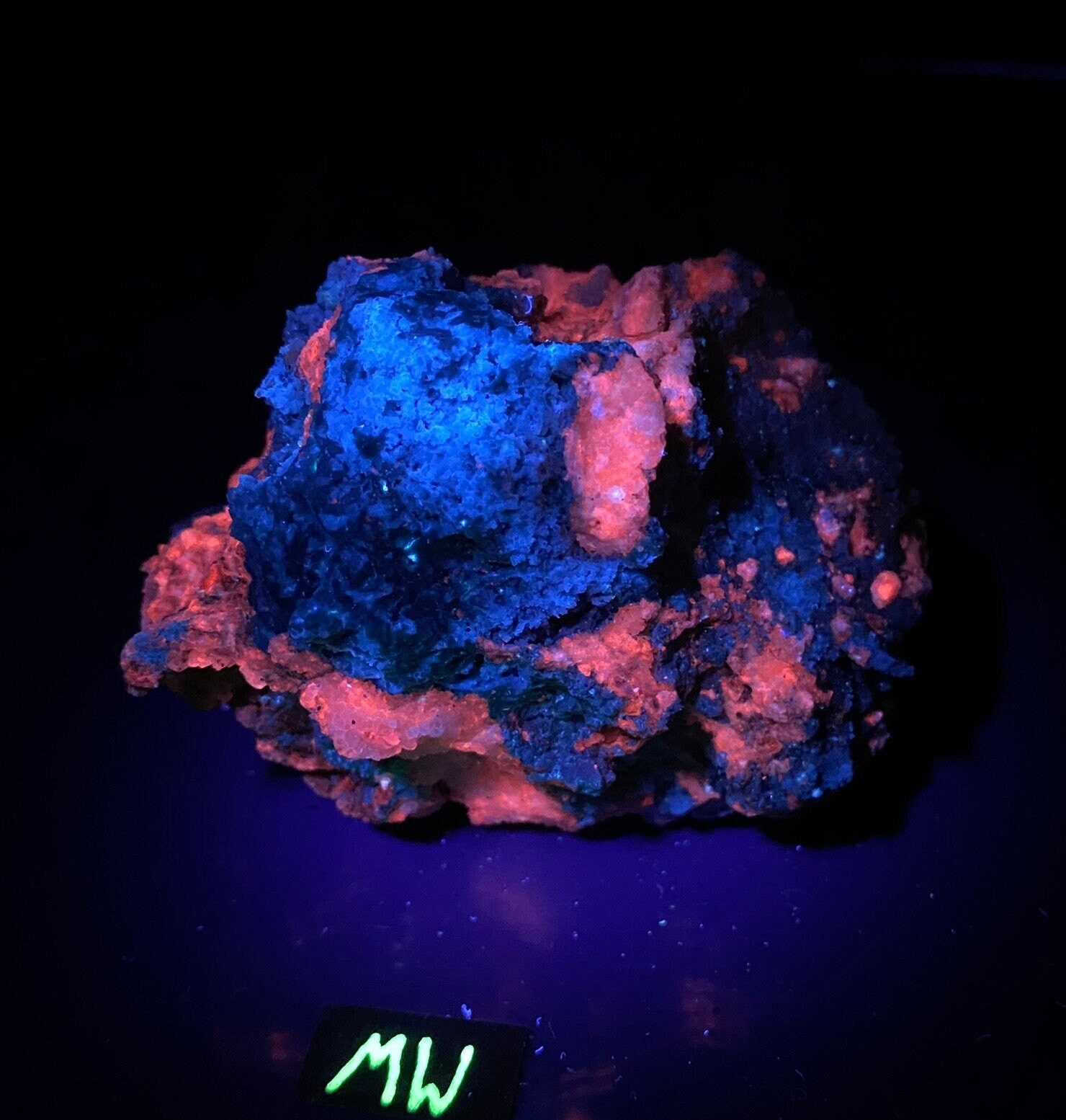 This amazing specimen contains some midwave UV (MW 310-4nm) fluorescent calcite and chrysocolla.