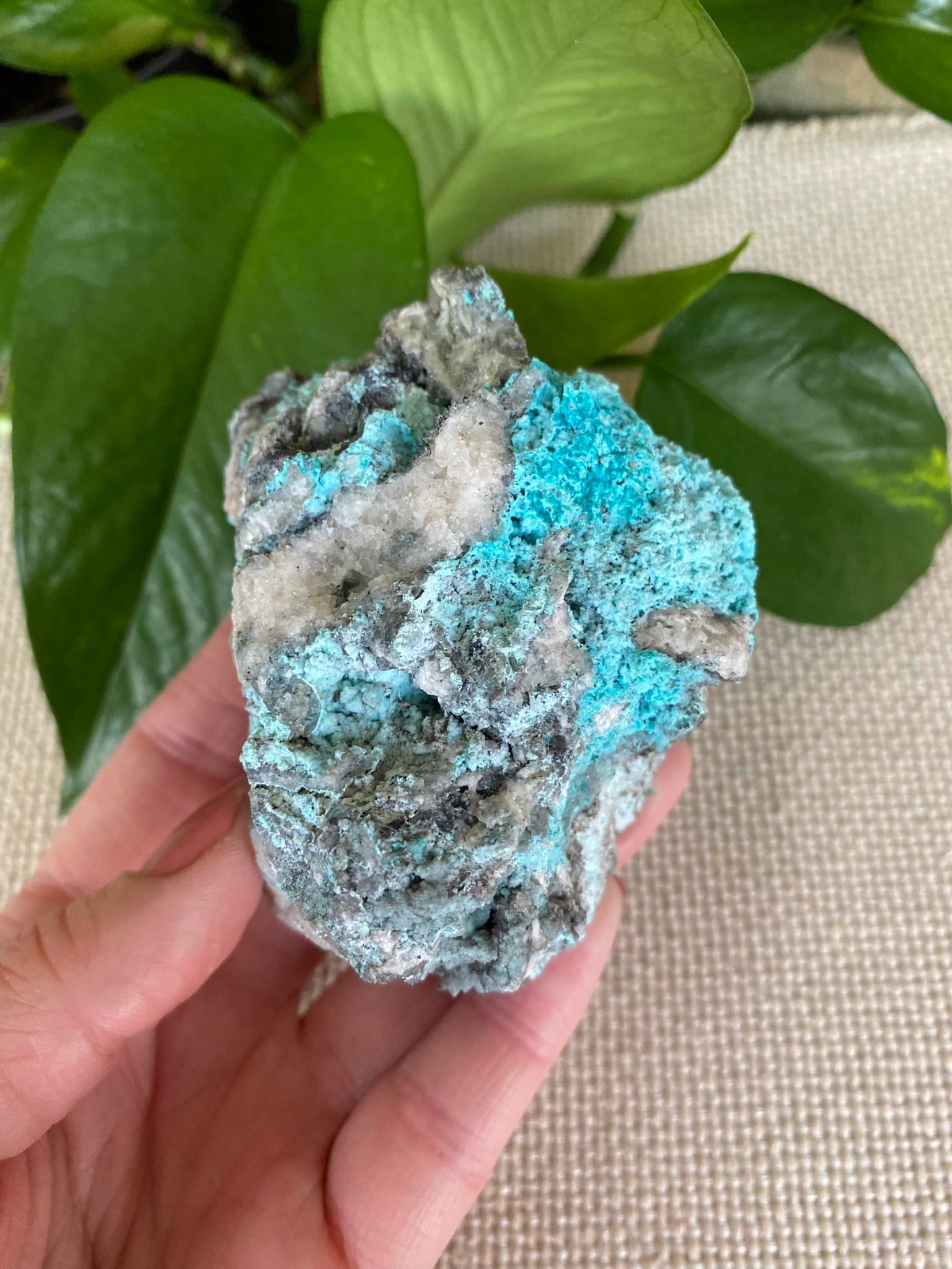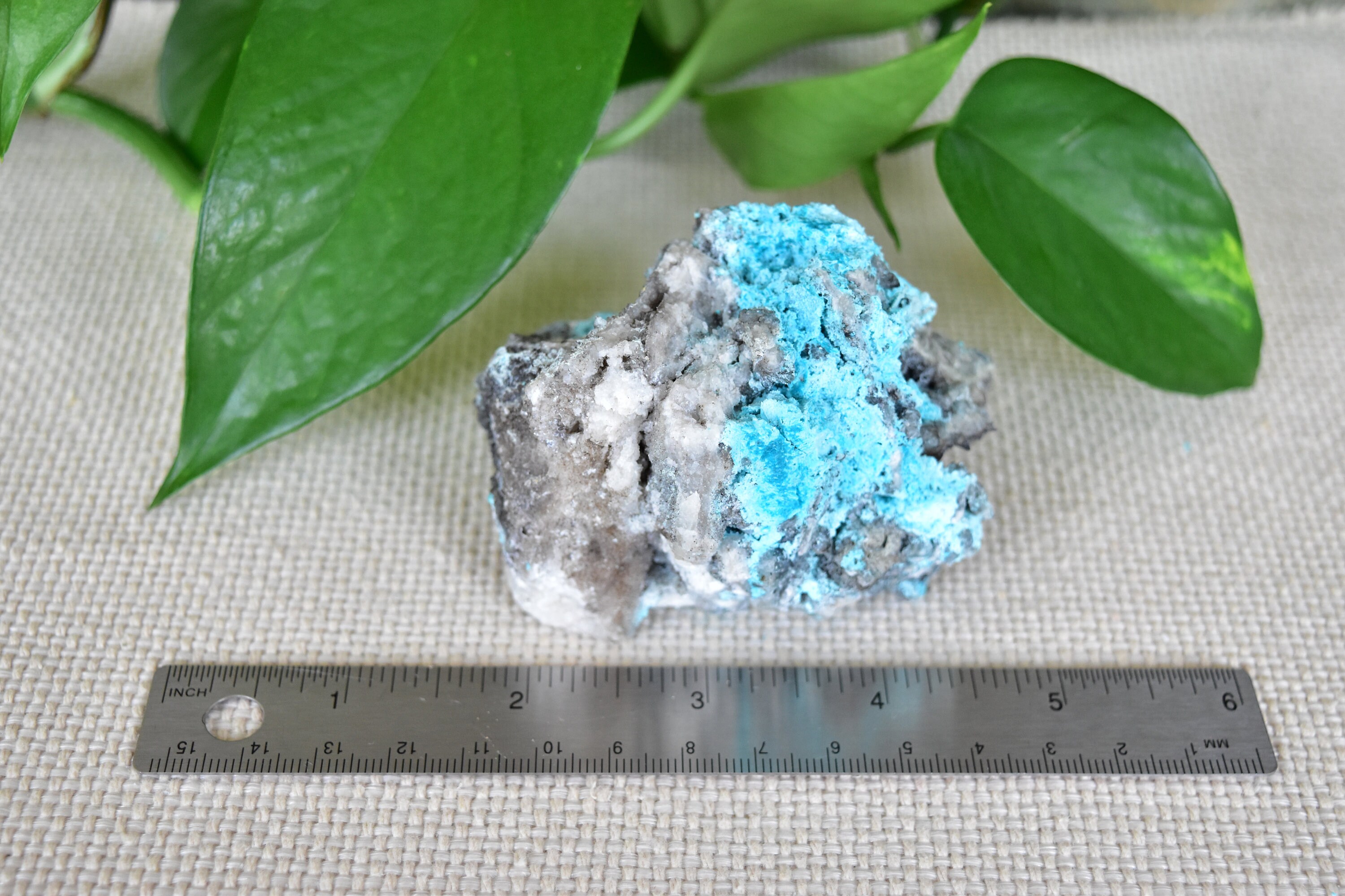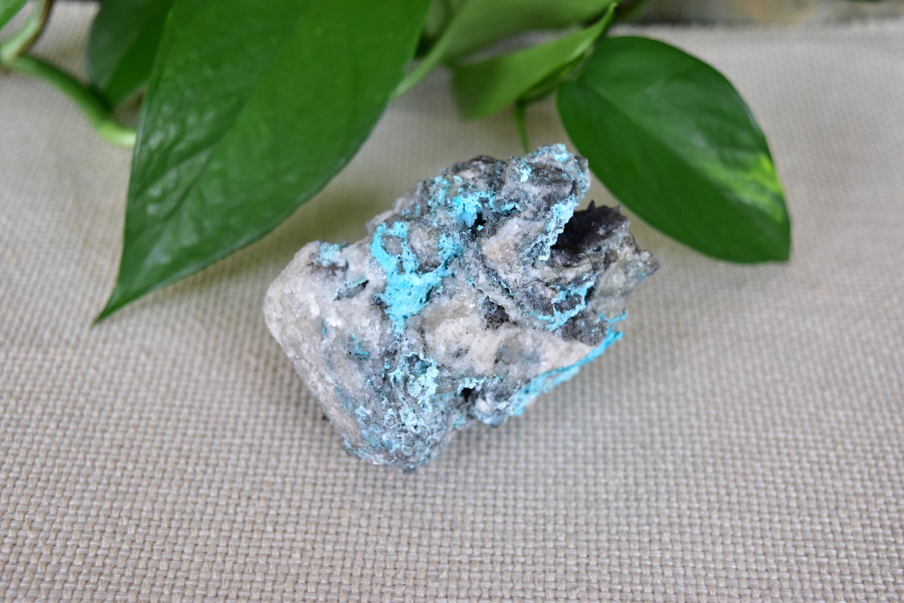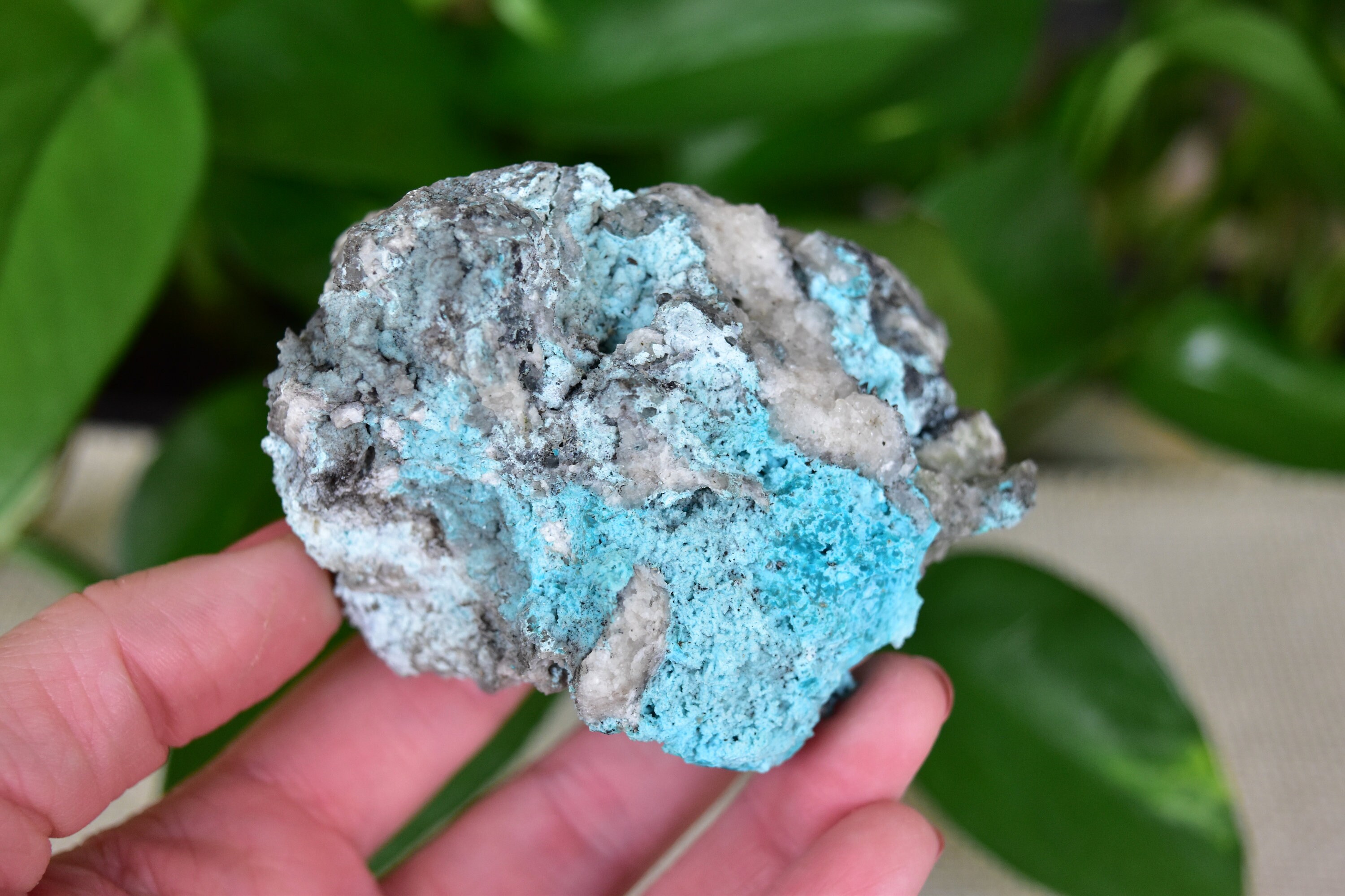 This amazing specimen contains some midwave UV (MW 310-4nm) fluorescent calcite and chrysocolla.