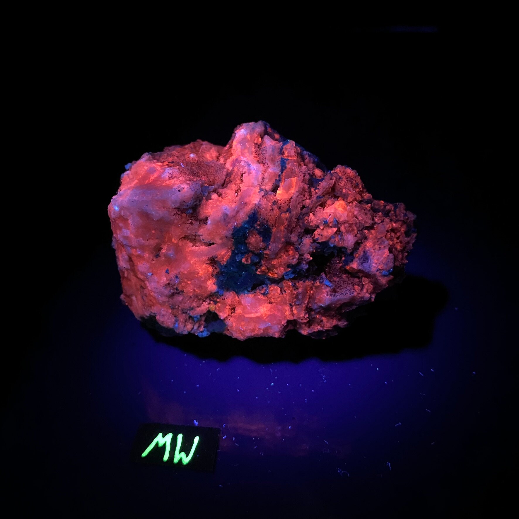 This material fluoresces neon orange under midwave UV light (MW 310nm). I also fluoresces under Shortwave and Longwave UV light but it is not as bright as midwave UV.