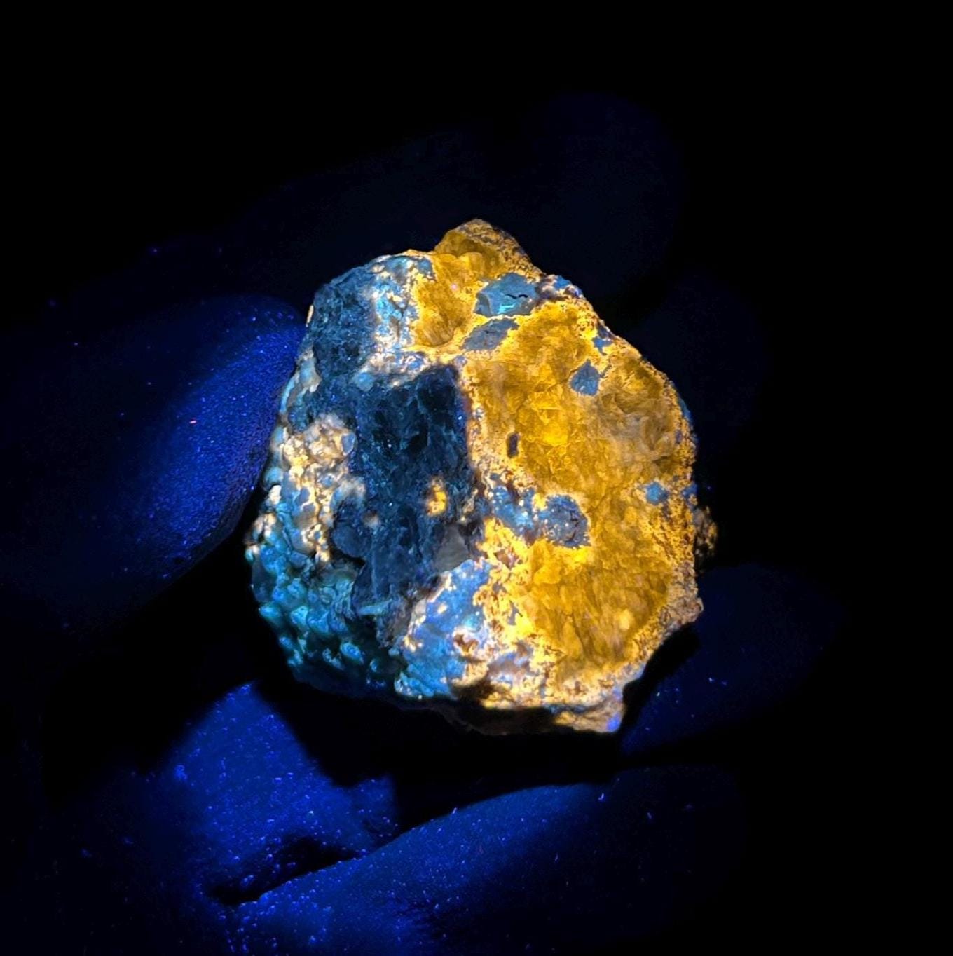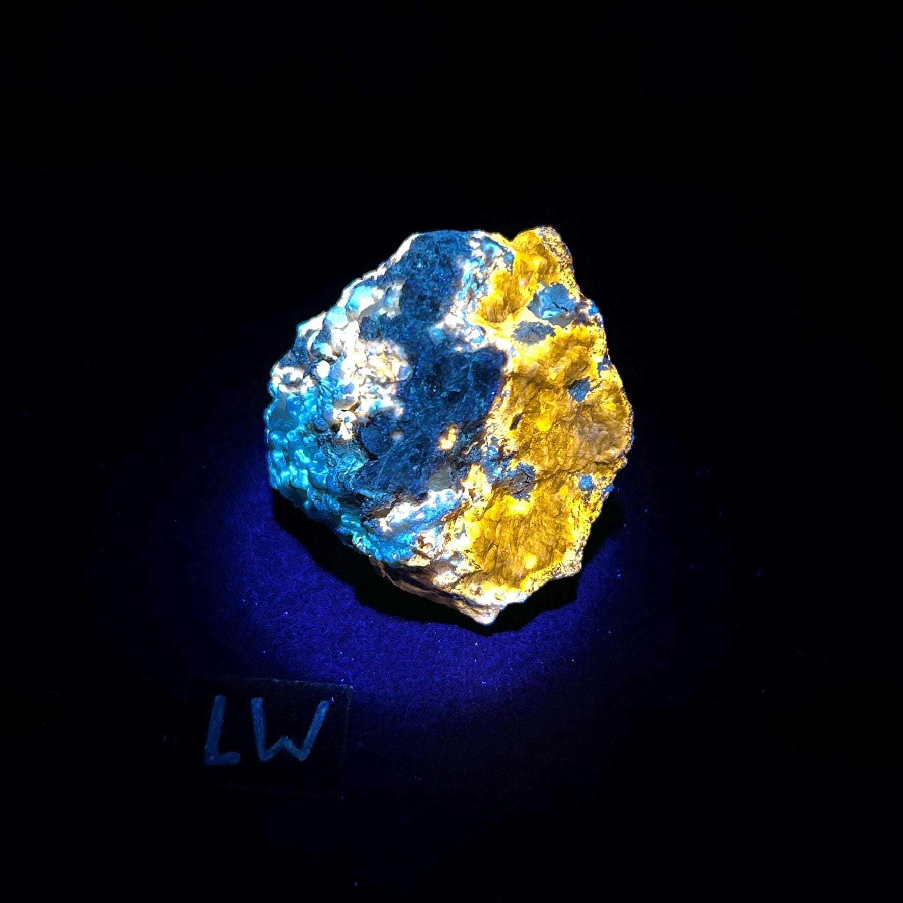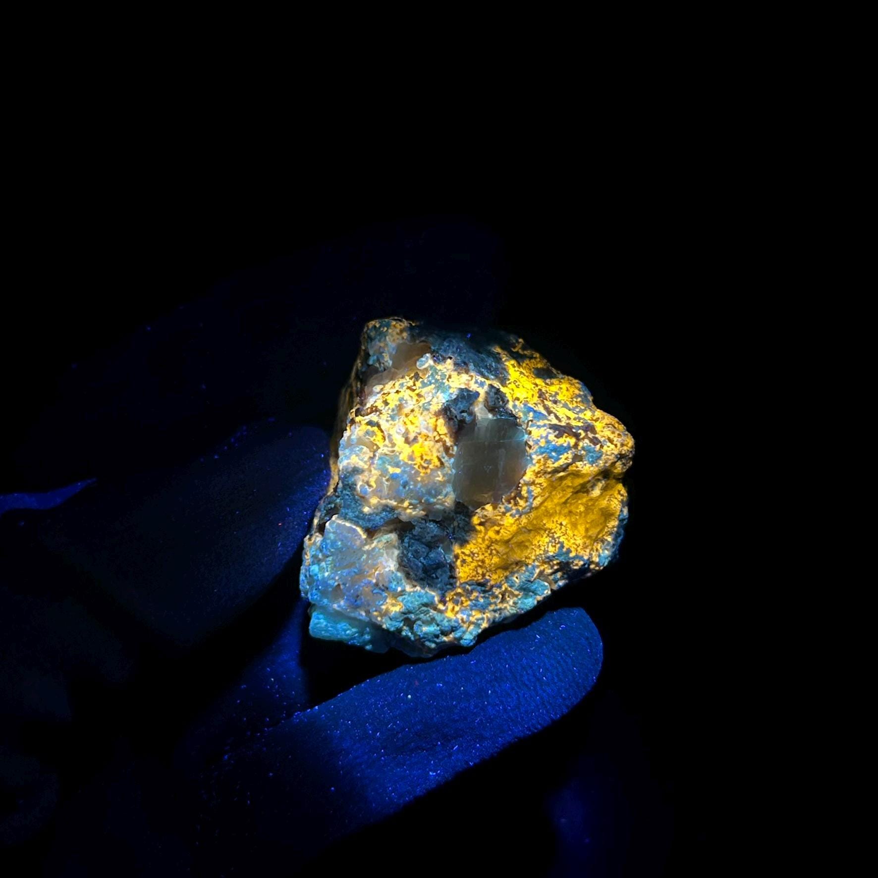 These crystals are white/grey color under daylight, and they fluoresce yellow and possibly blue color under filtered Longwave (365nm) UV light. They also fluoresce orange and yellow colors under Mindwave (MW 310nm) UV lights. Super interesting Midwave fluorescence!!!