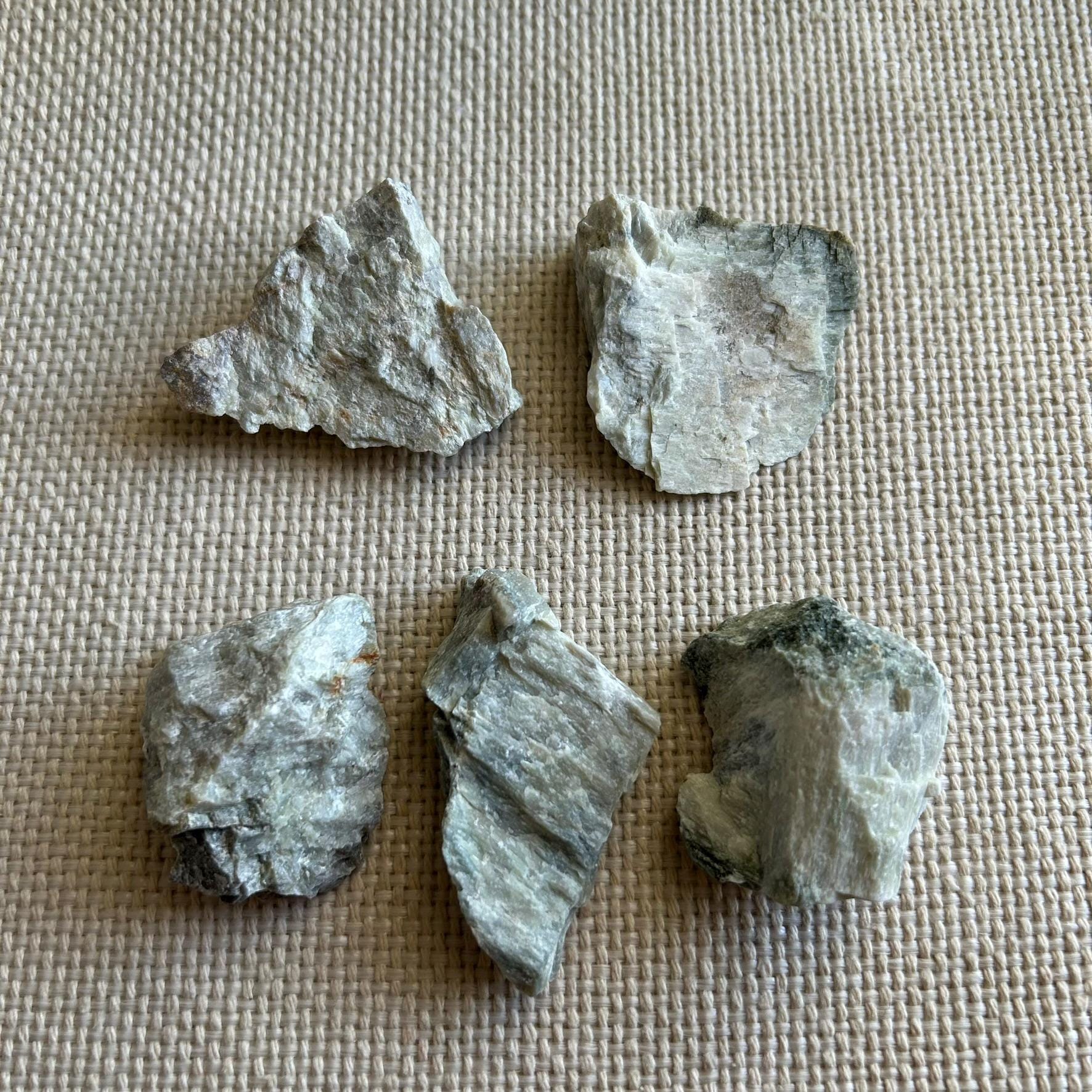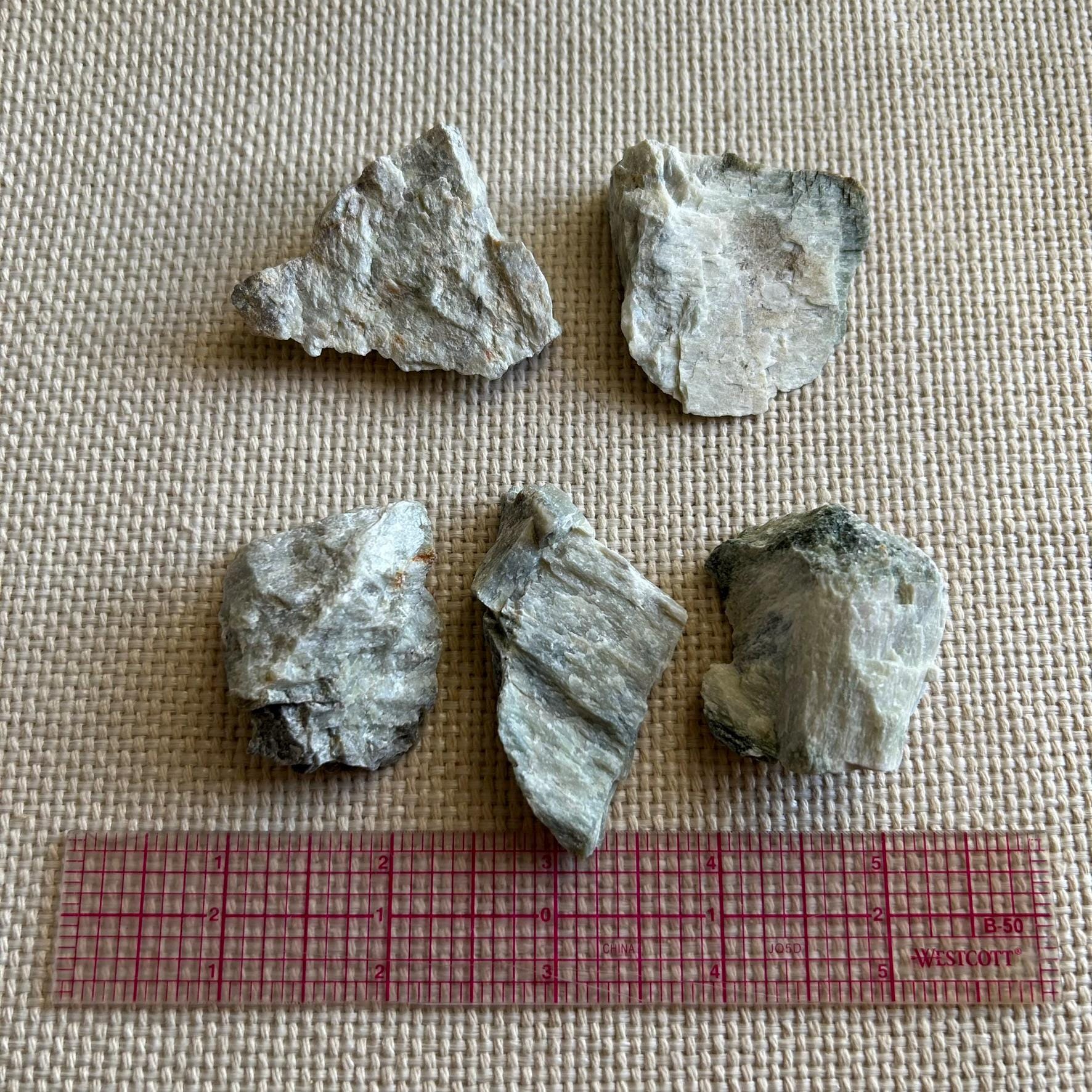 This listing is for ONE fluorescent scapolite and prehnite specimen that is about 1.75" long approximately.
