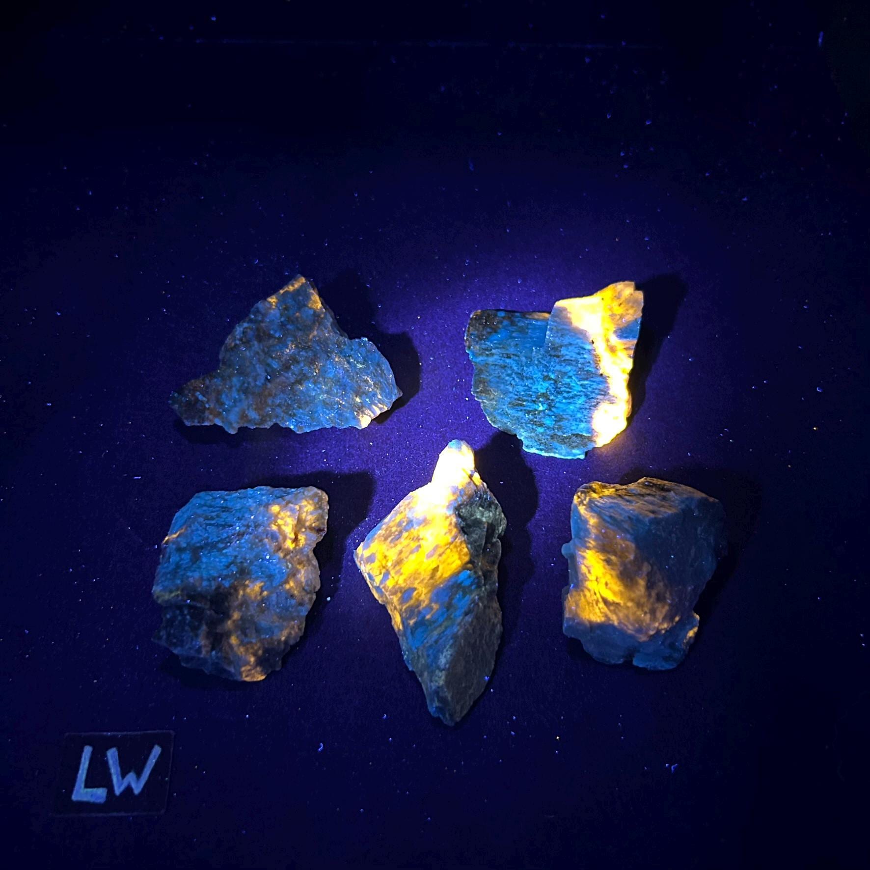 A true filtered Longwave UV light (LW 365nm) is needed to see the strong fluorescence shown in the photos. Regular black lights will not show any fluorescence.