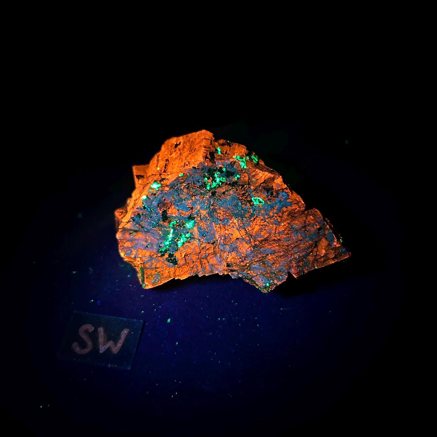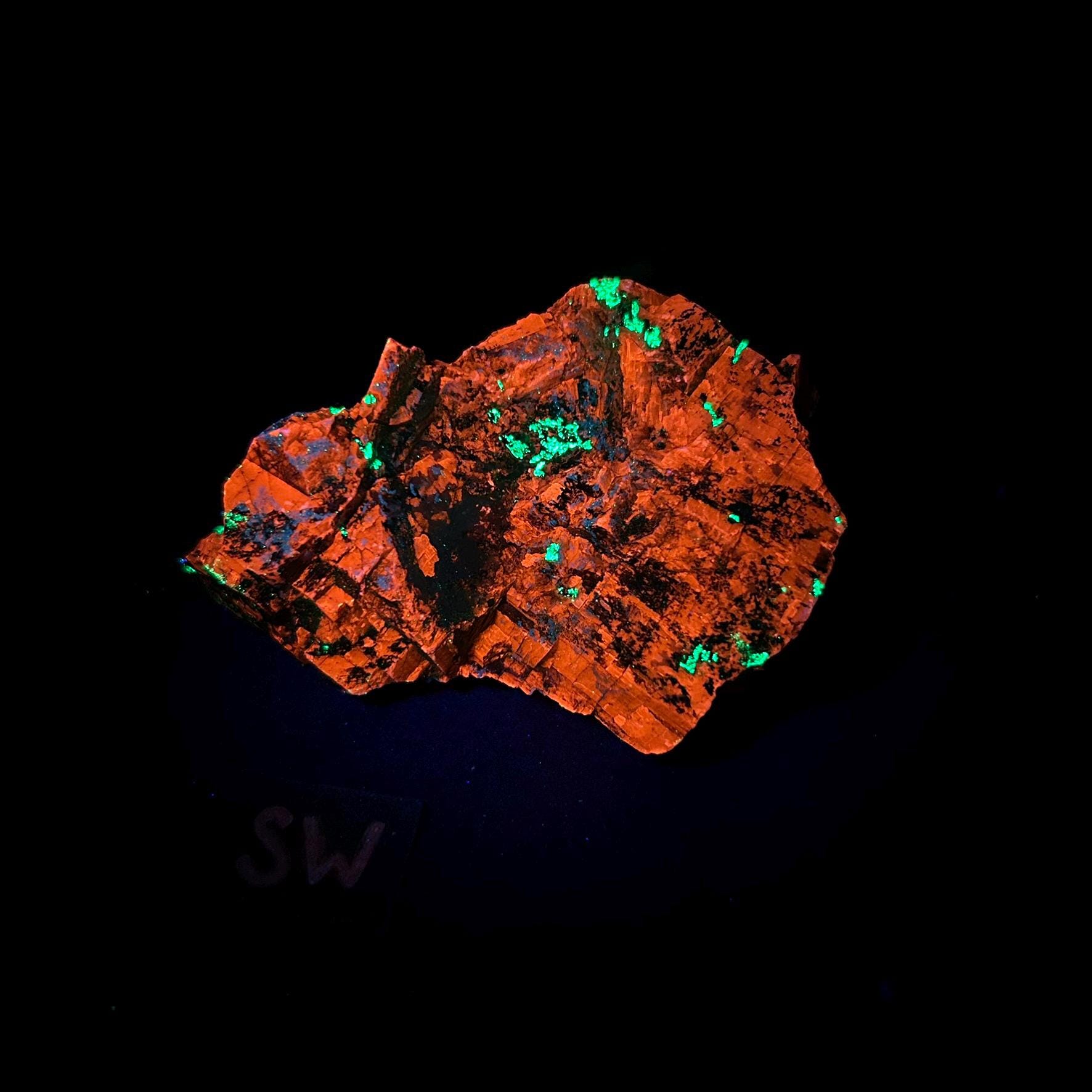 This one of a kind mineral specimen from New Jersey, USA, features fluorescent willemite, calcite, and franklinite. This specimen fluoresces under a shortwave uv light only.