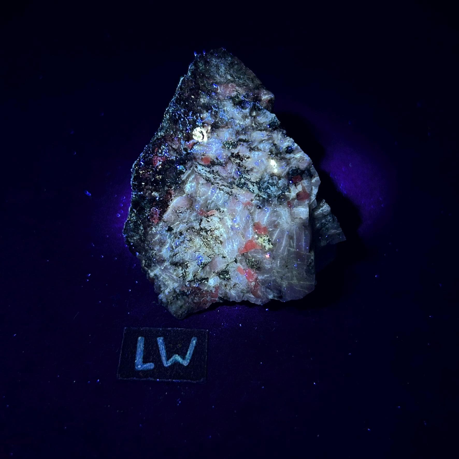 This specimen contains fluorescent calcite, dolomite, and hydrozincite. The calcite and dolomite combination from the New Jersey area is usually called "crazy calcite".