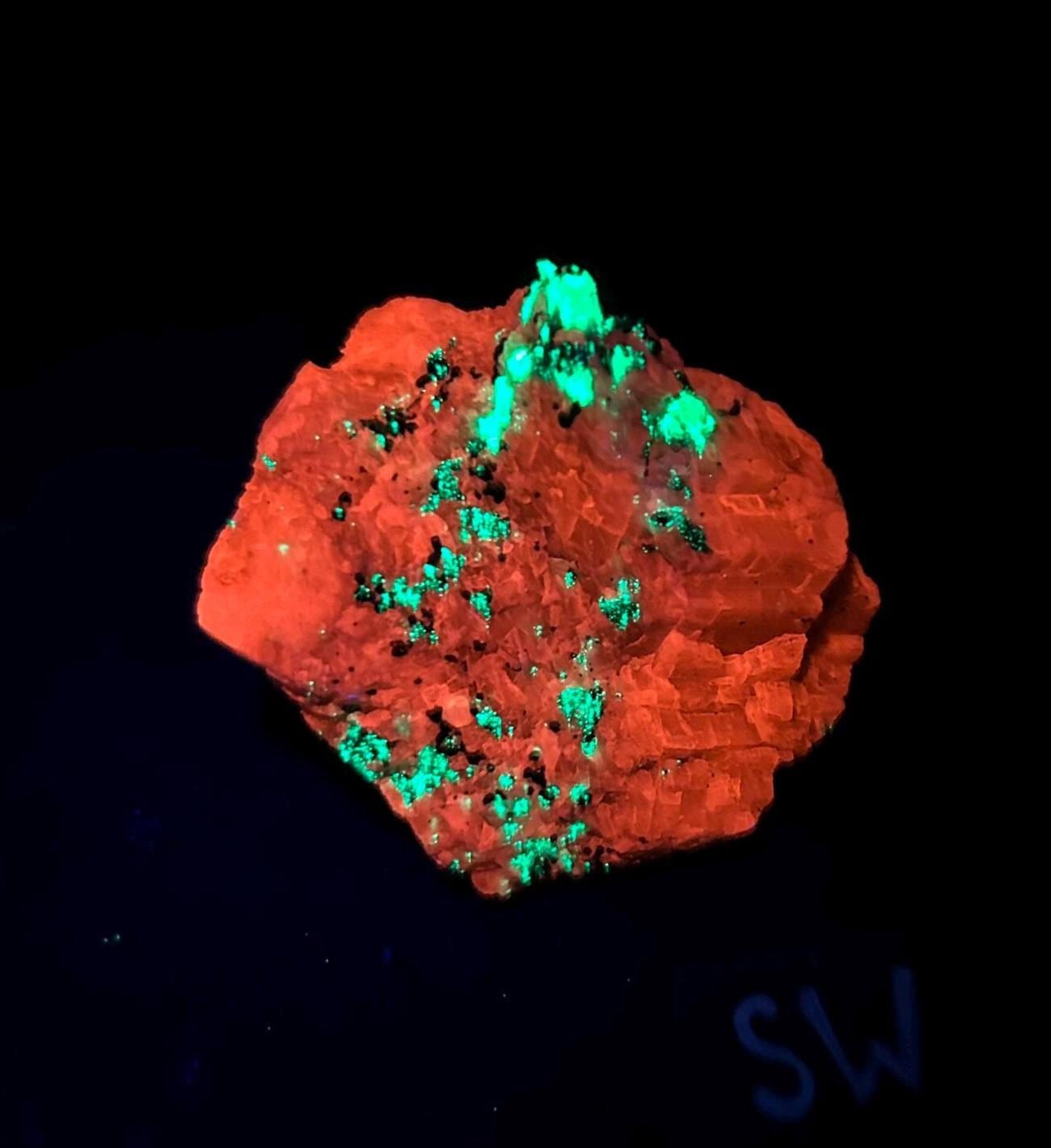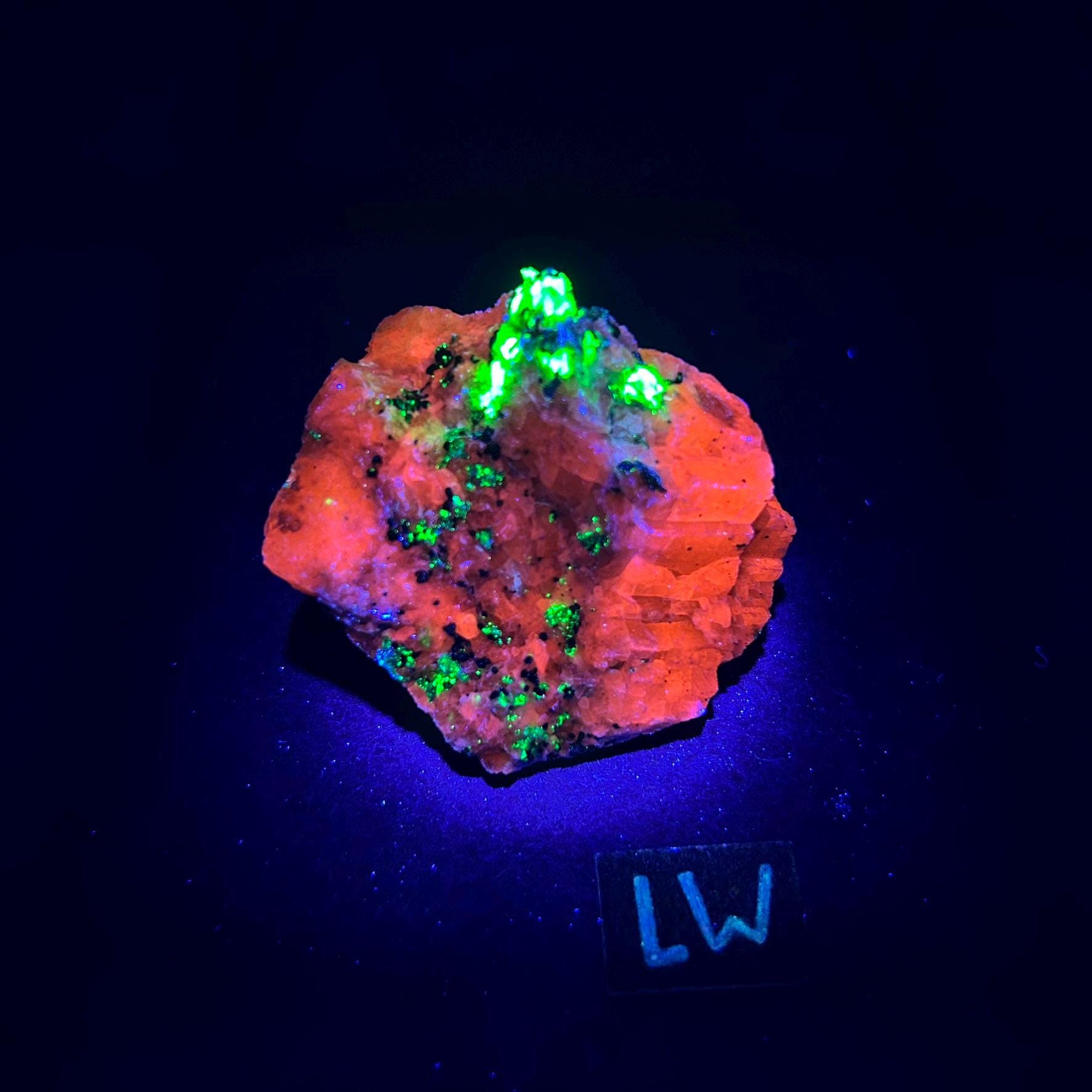 This one of a kind mineral specimen from New Jersey, USA, features fluorescent willemite, calcite, and franklinite. This specimen fluoresces under a shortwave uv light, and very lightly under a longwave uv light.