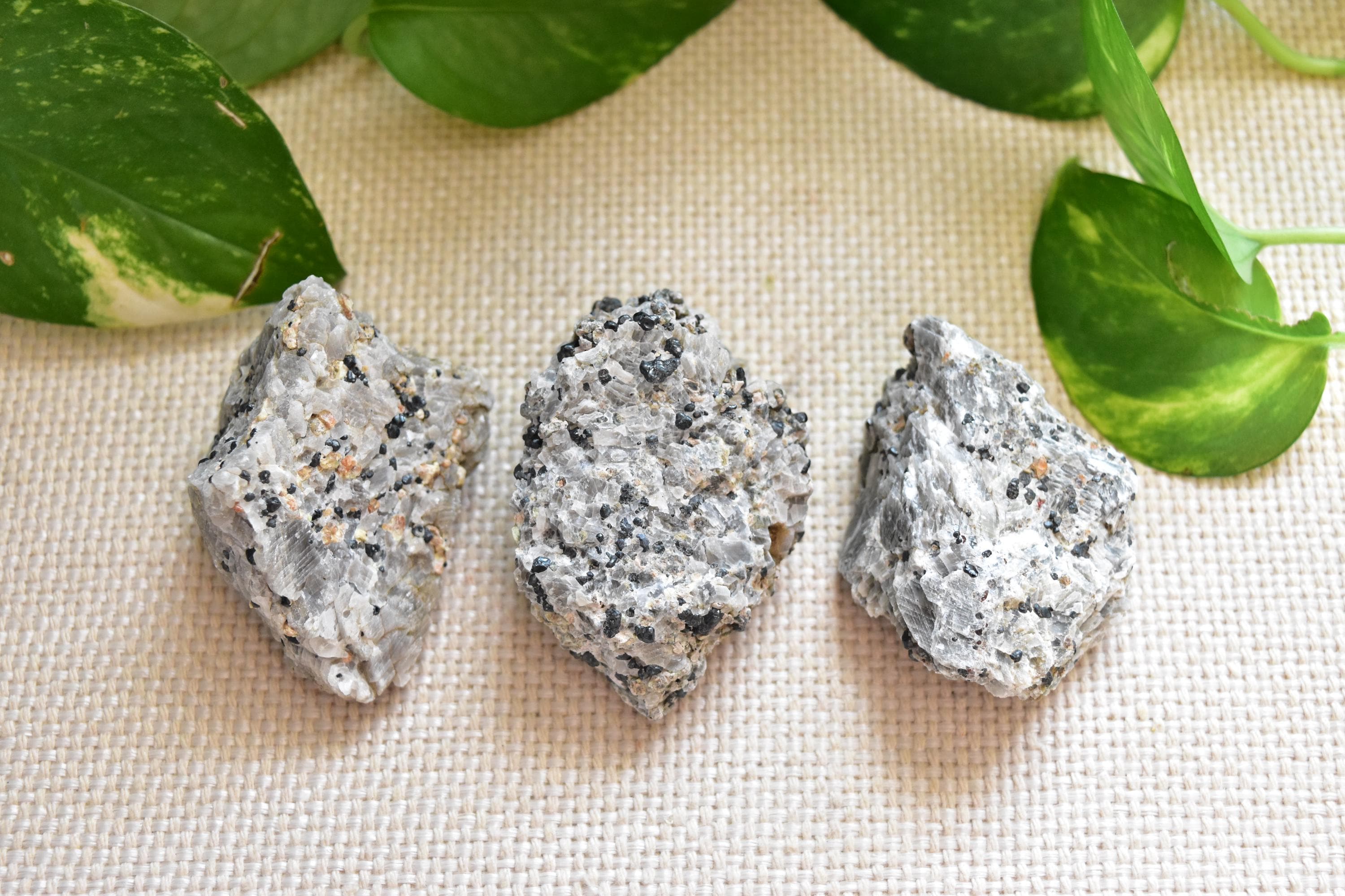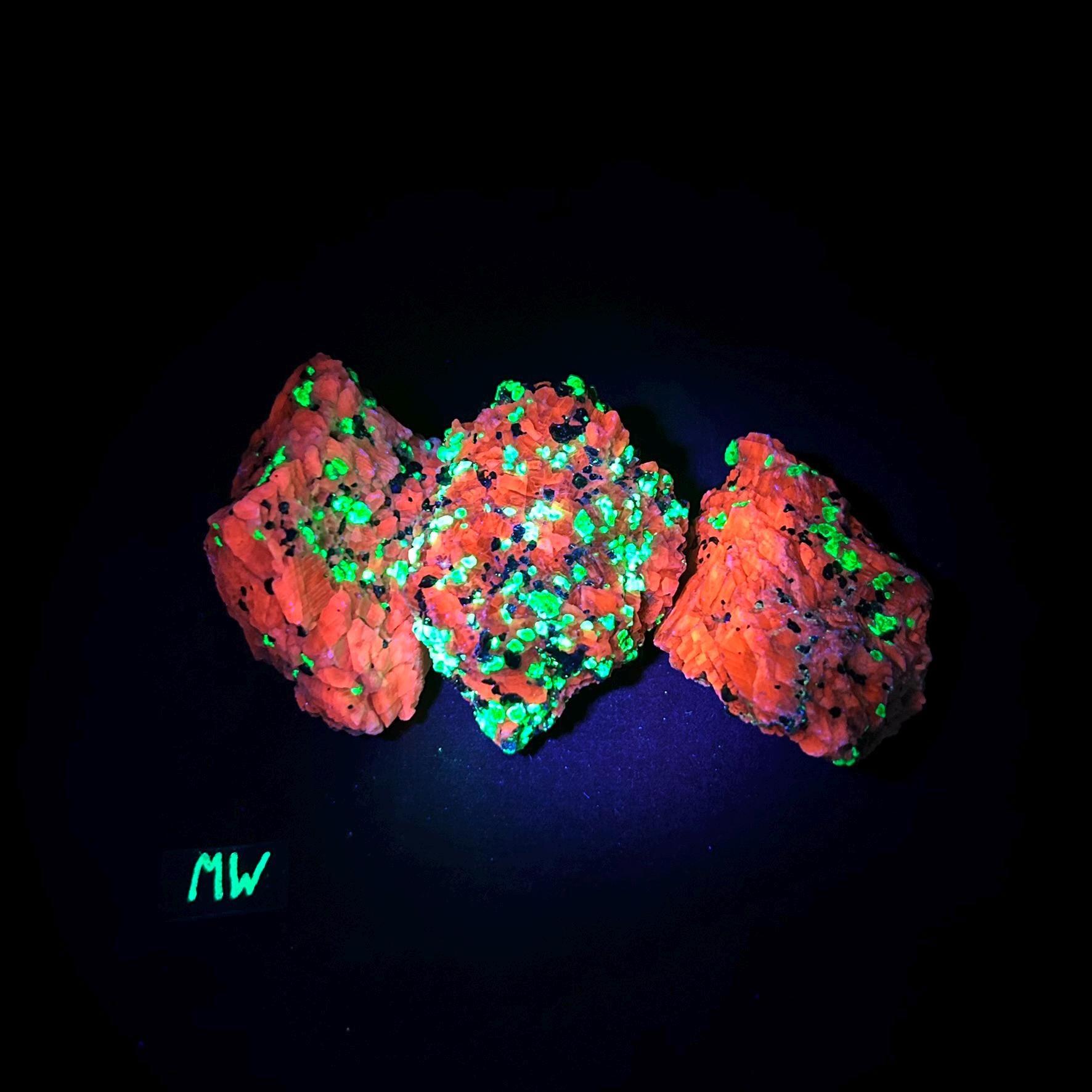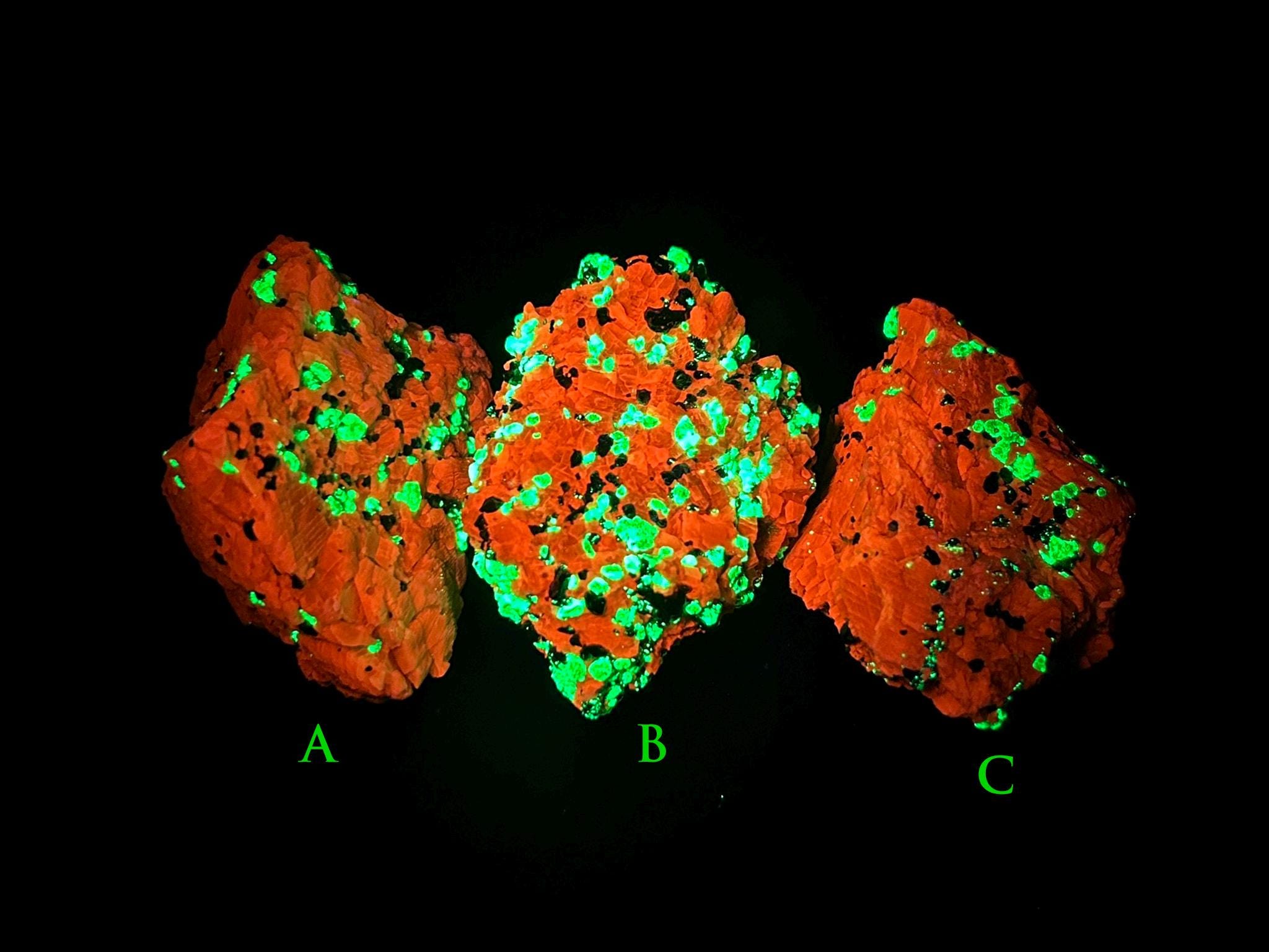 These mineral specimen (A, B, or C) from New Jersey feature fluorescent willemite, calcite, and franklinite. Although some fluorescence can be seen using a longwave (365nm) uv light, the best fluorescence will be with a shortwave (254nm) UV light.