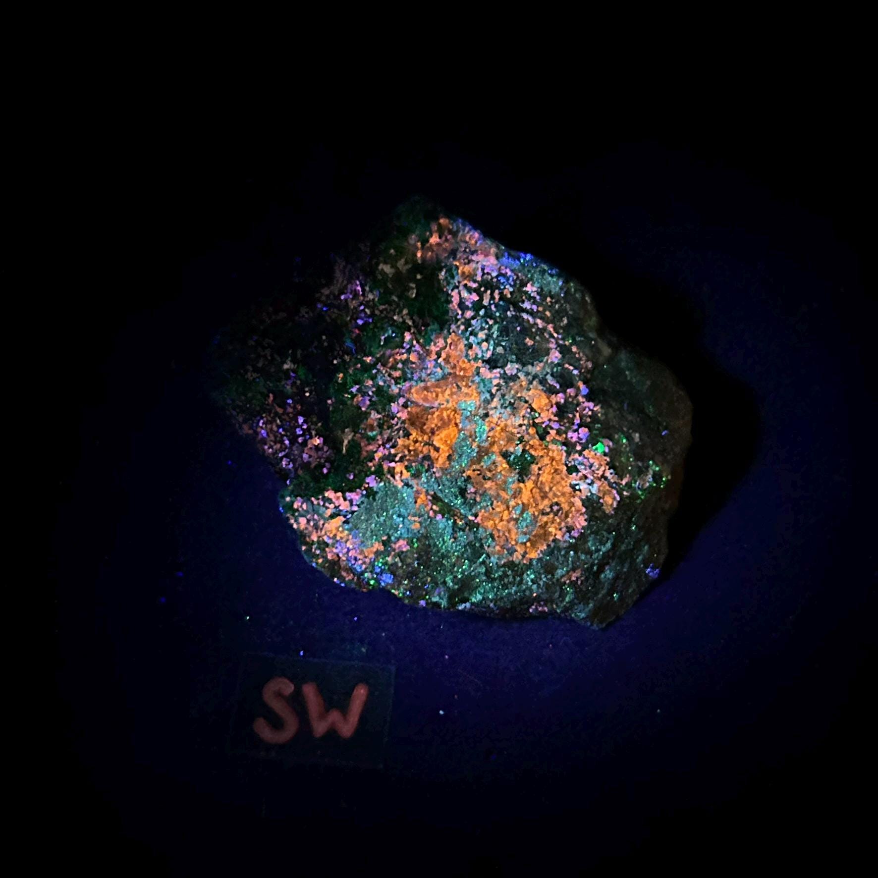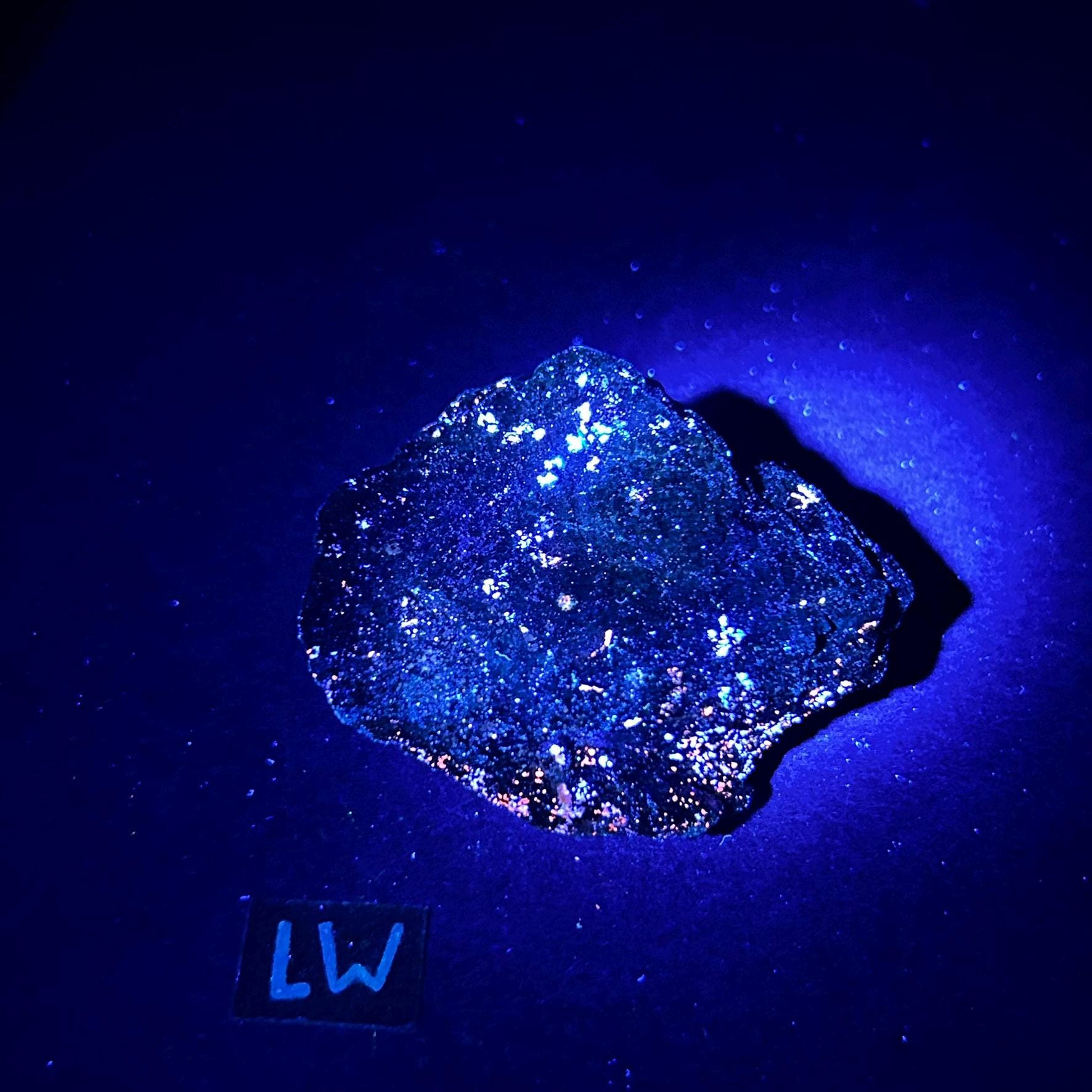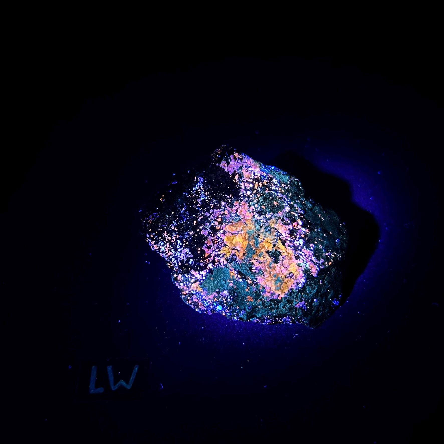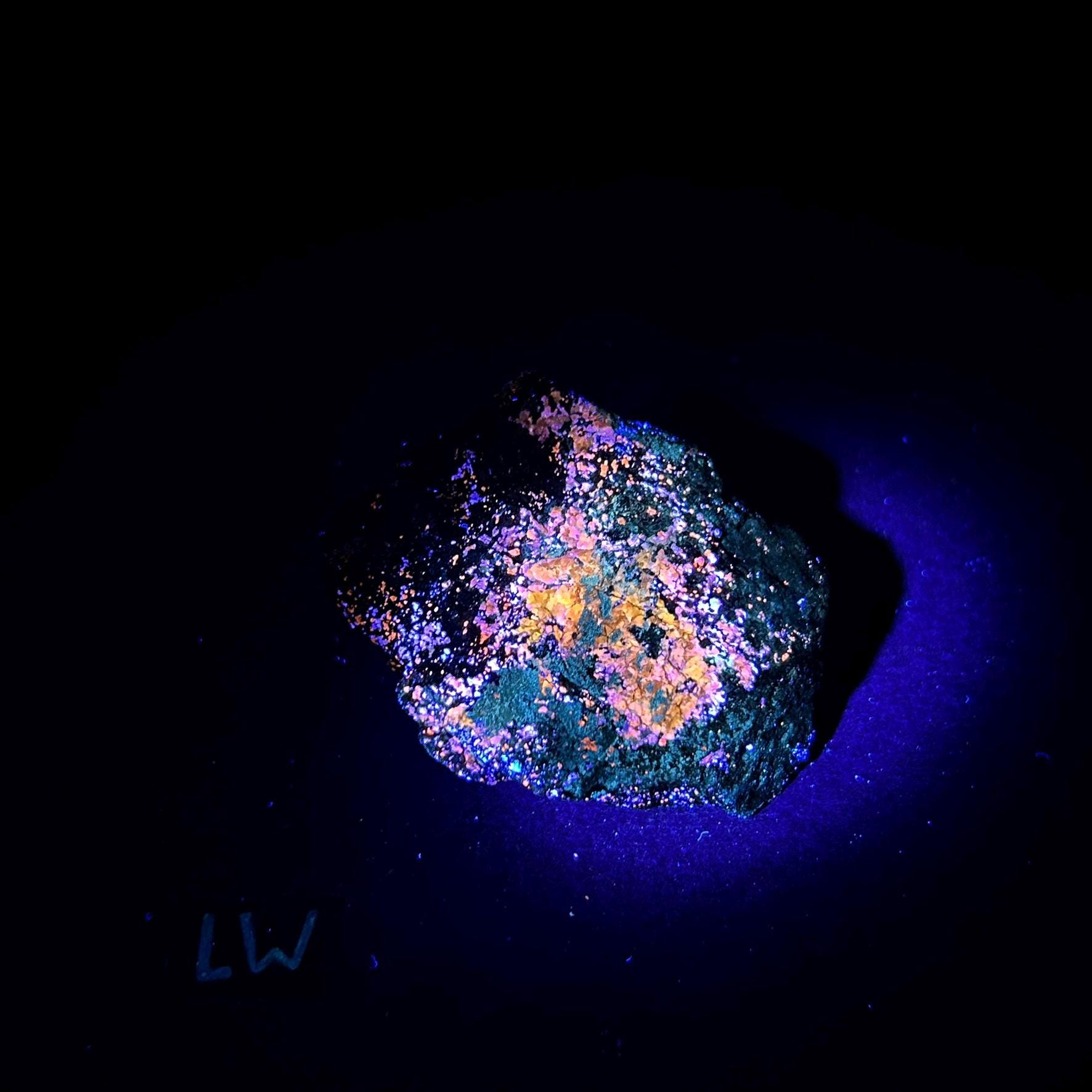 A filtered longwave uv light (lw 365nm) is necessary to see the best fluorescence in this specimen.