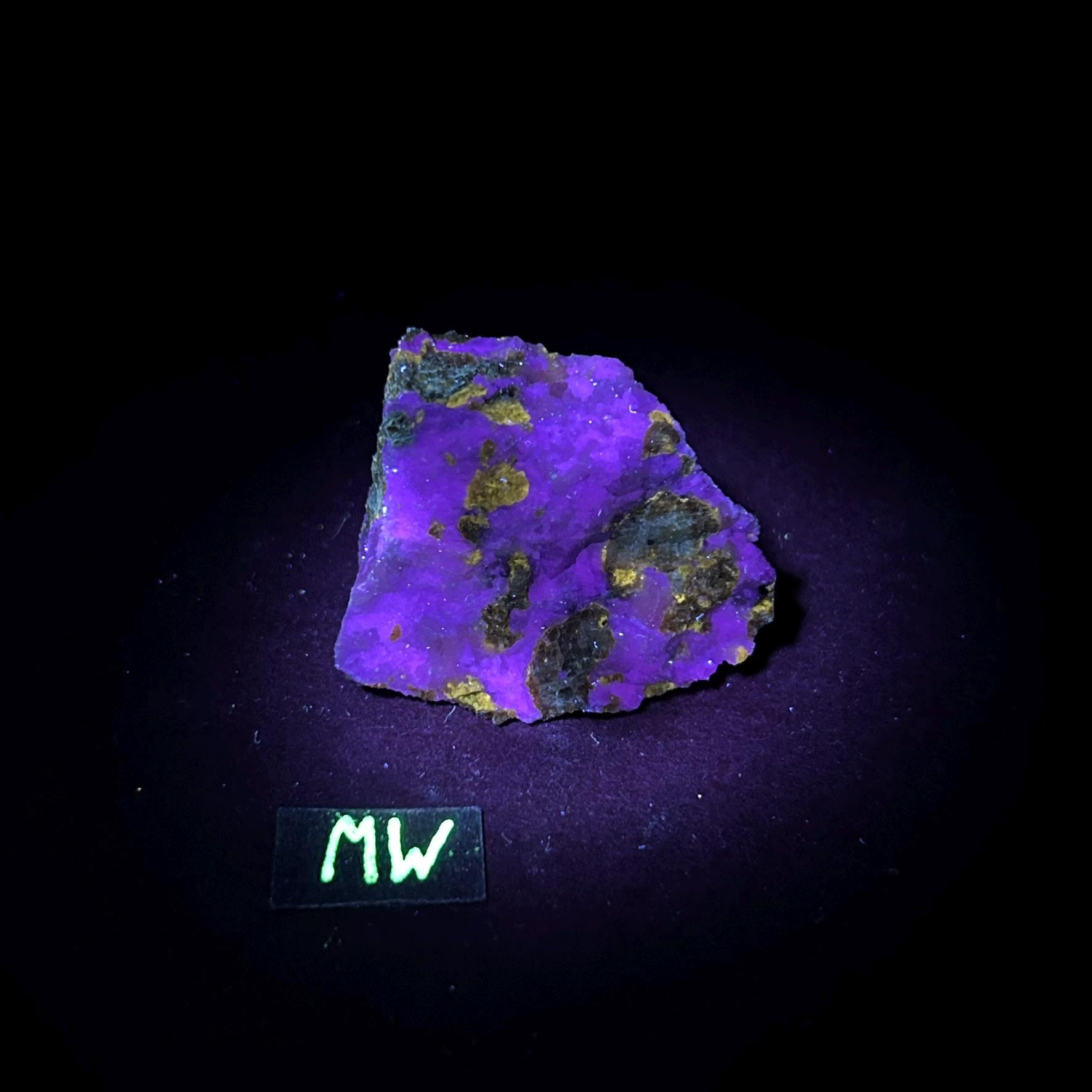 This mineral specimen from New Jersey features some fluorescent norbergite with minor pyrite, on a calcite matrix. This specimen fluoresces under a shortwave 254nm uv light. The calcite fluoresces purple under a midwave 310nm uv light.