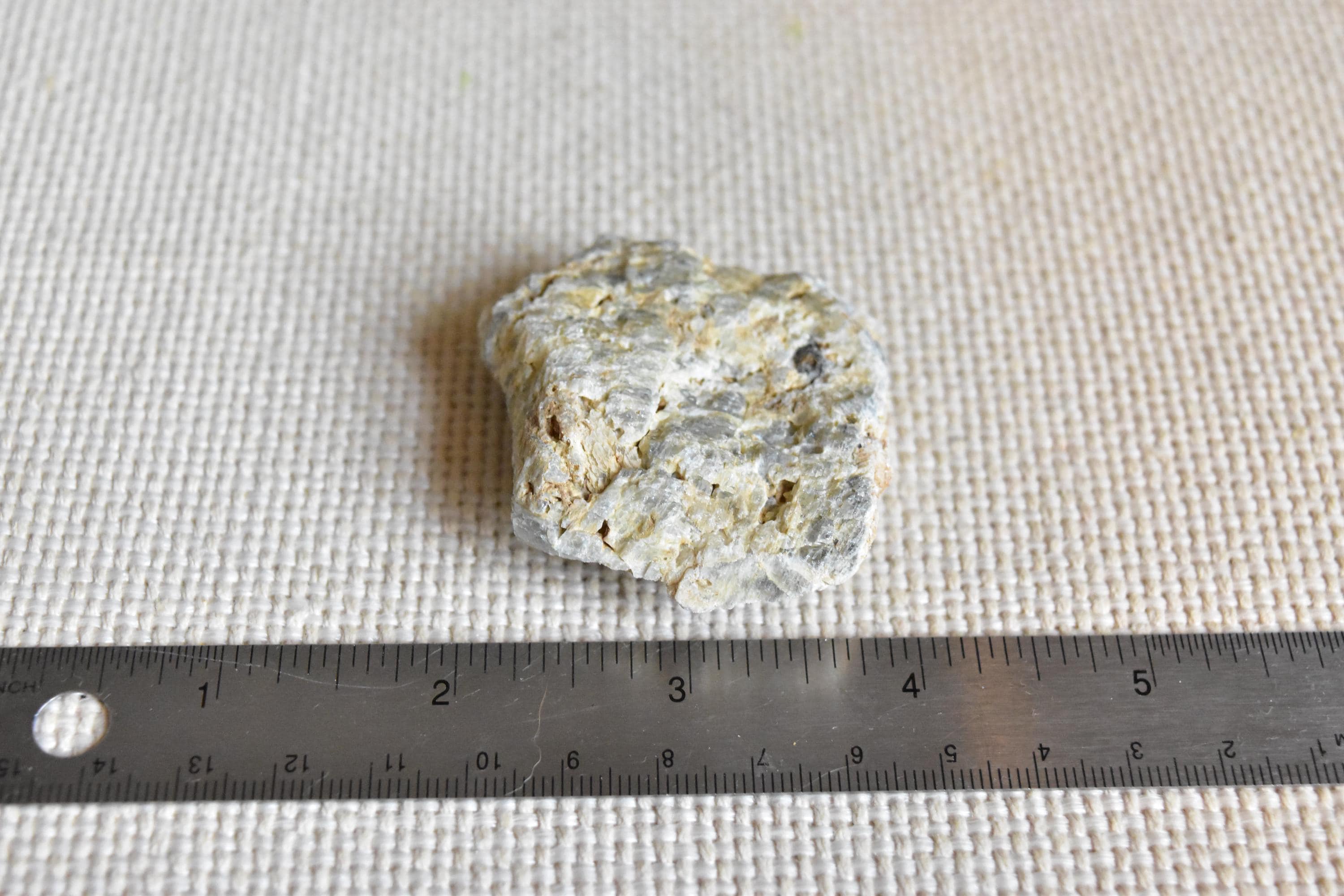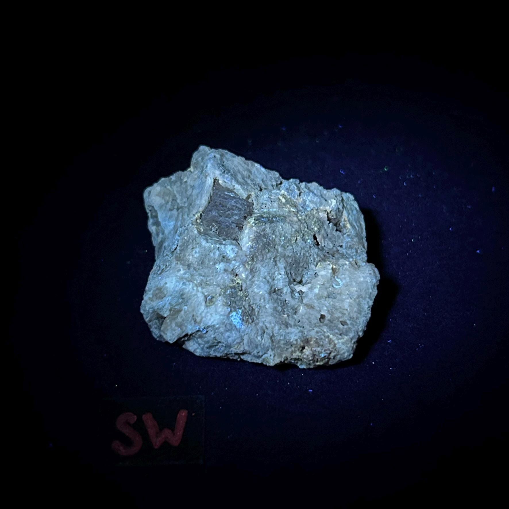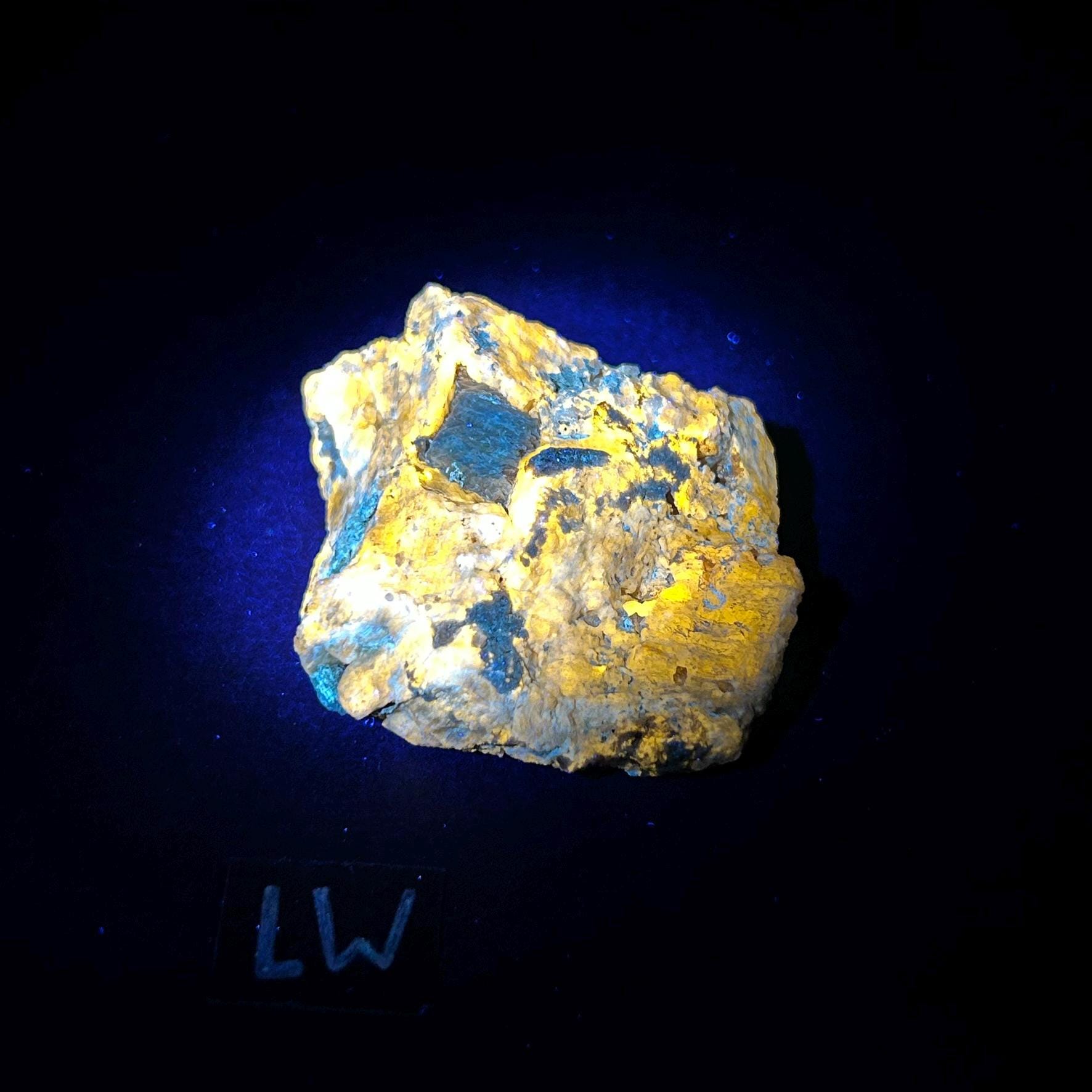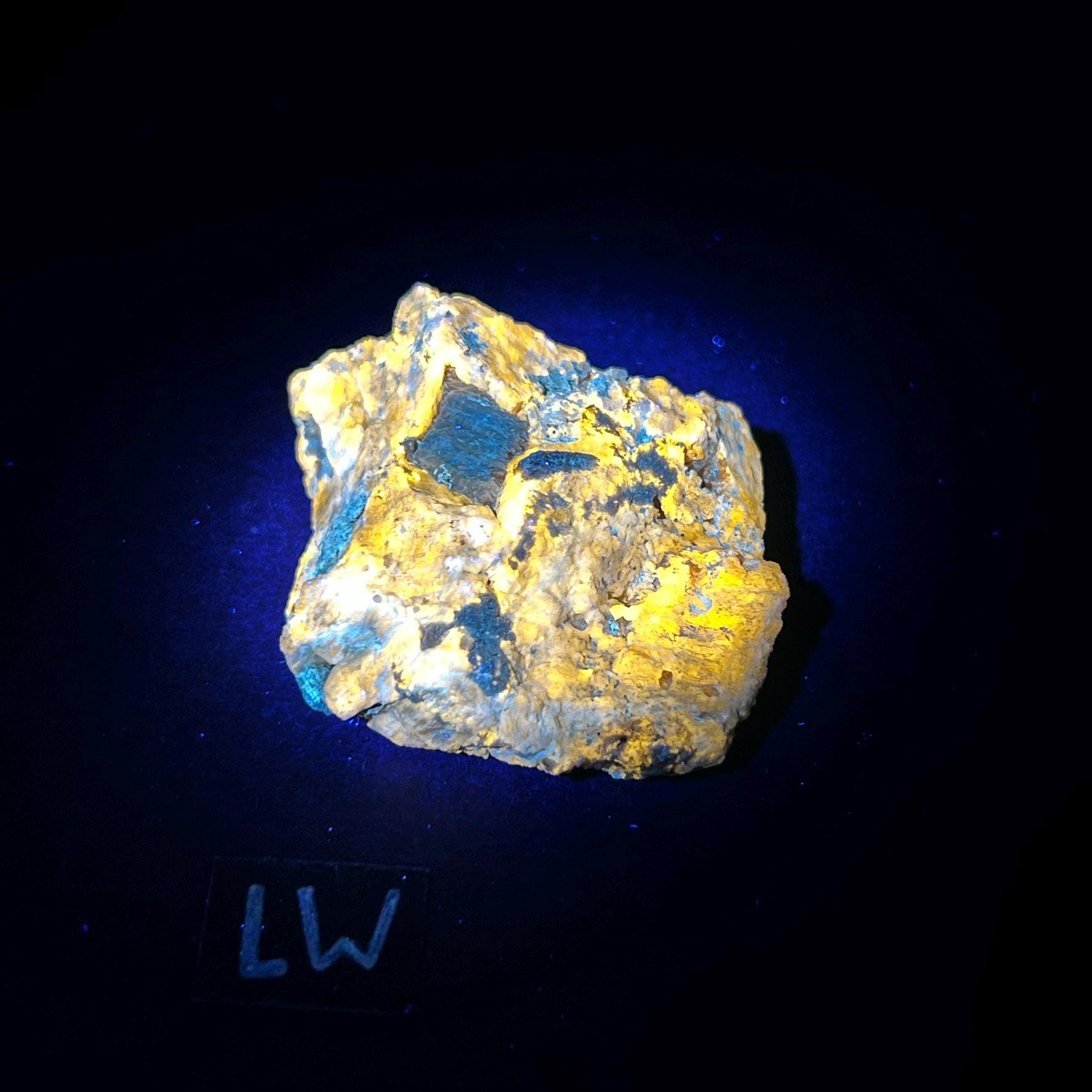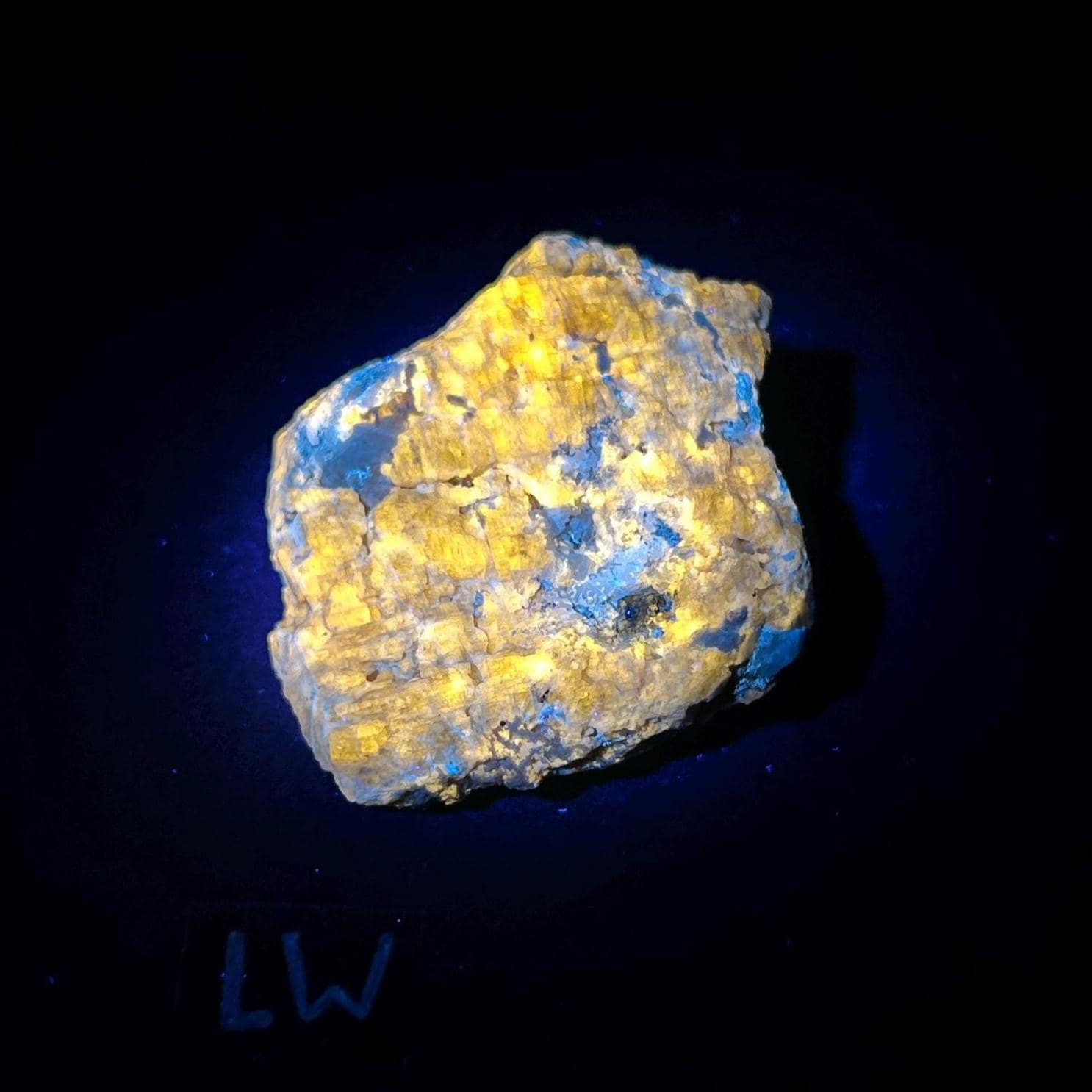 This specimen contains yellow fluorescing scapolite, and minor calcite. The best and brightest fluorescence can be seen with a longwave (LW 356nm) UV light.
