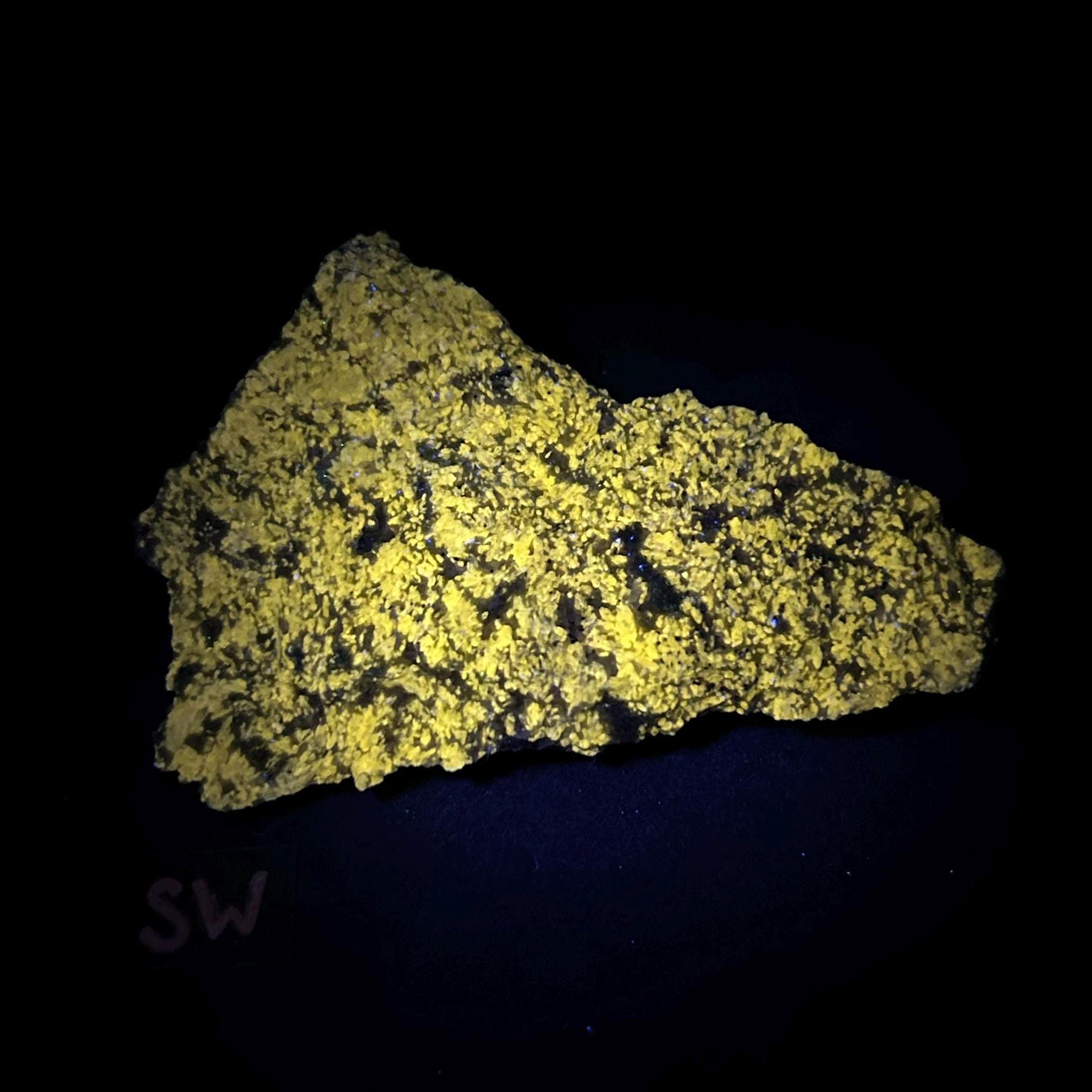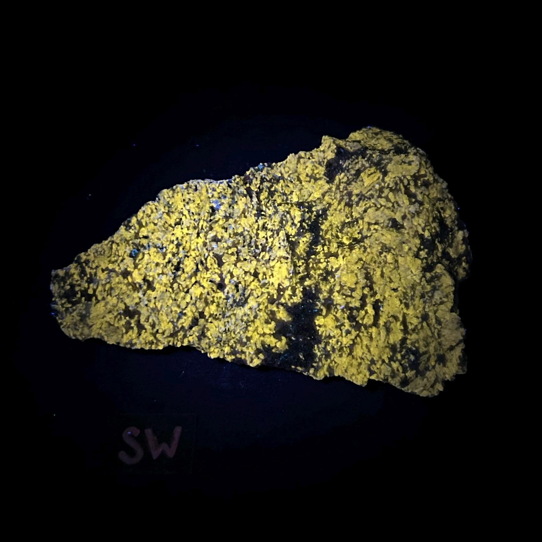 This mineral specimen from New Jersey features shortwave fluorescent wollastonite and minor pyrite. This specimen fluoresces under a shortwave uv light only.