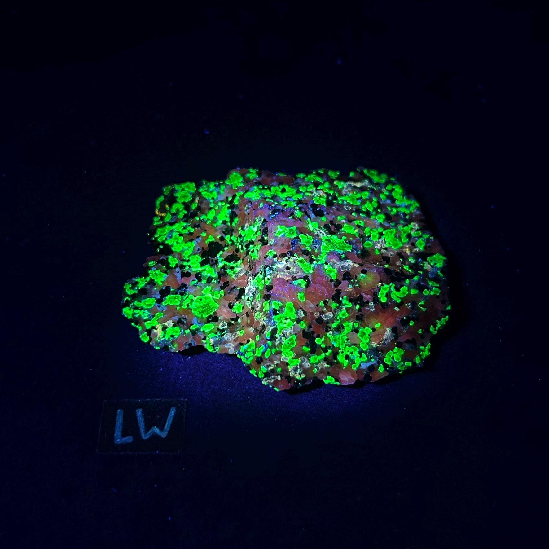 This mineral specimen from New Jersey features fluorescent willemite, calcite, and franklinite, with minor hardystonite specs. Although some fluorescence can be seen using a longwave (365nm) uv light, the best fluorescence will be with a shortwave (254nm) UV light.