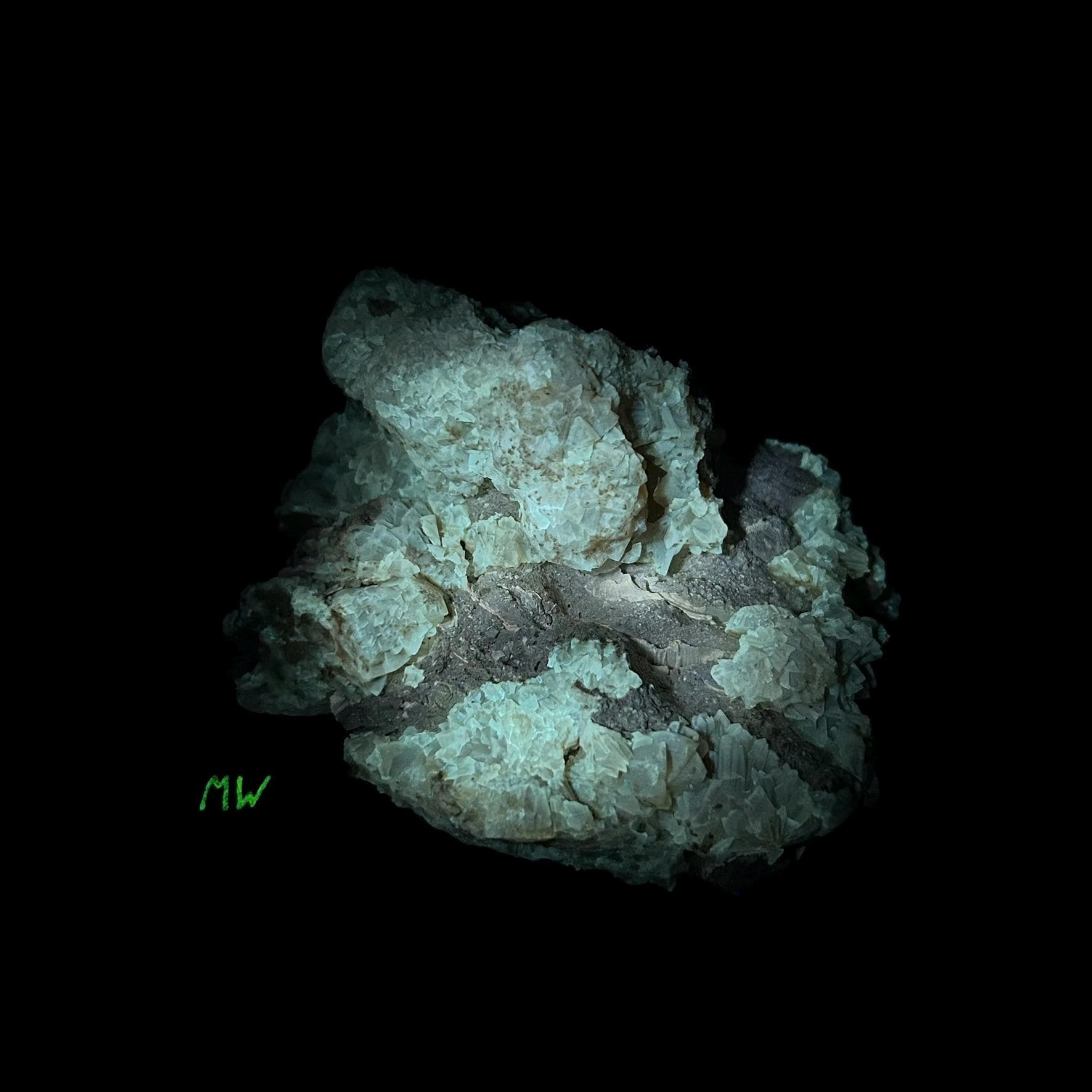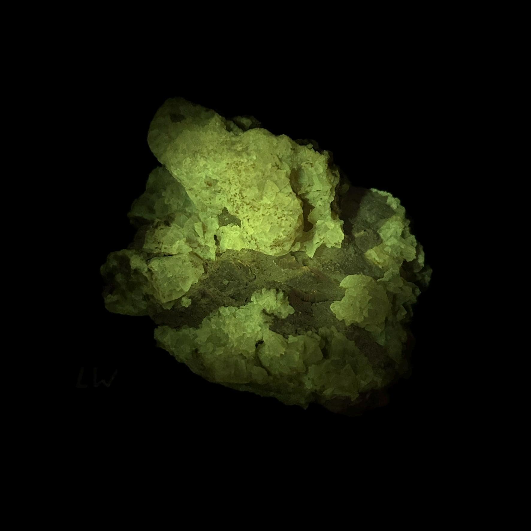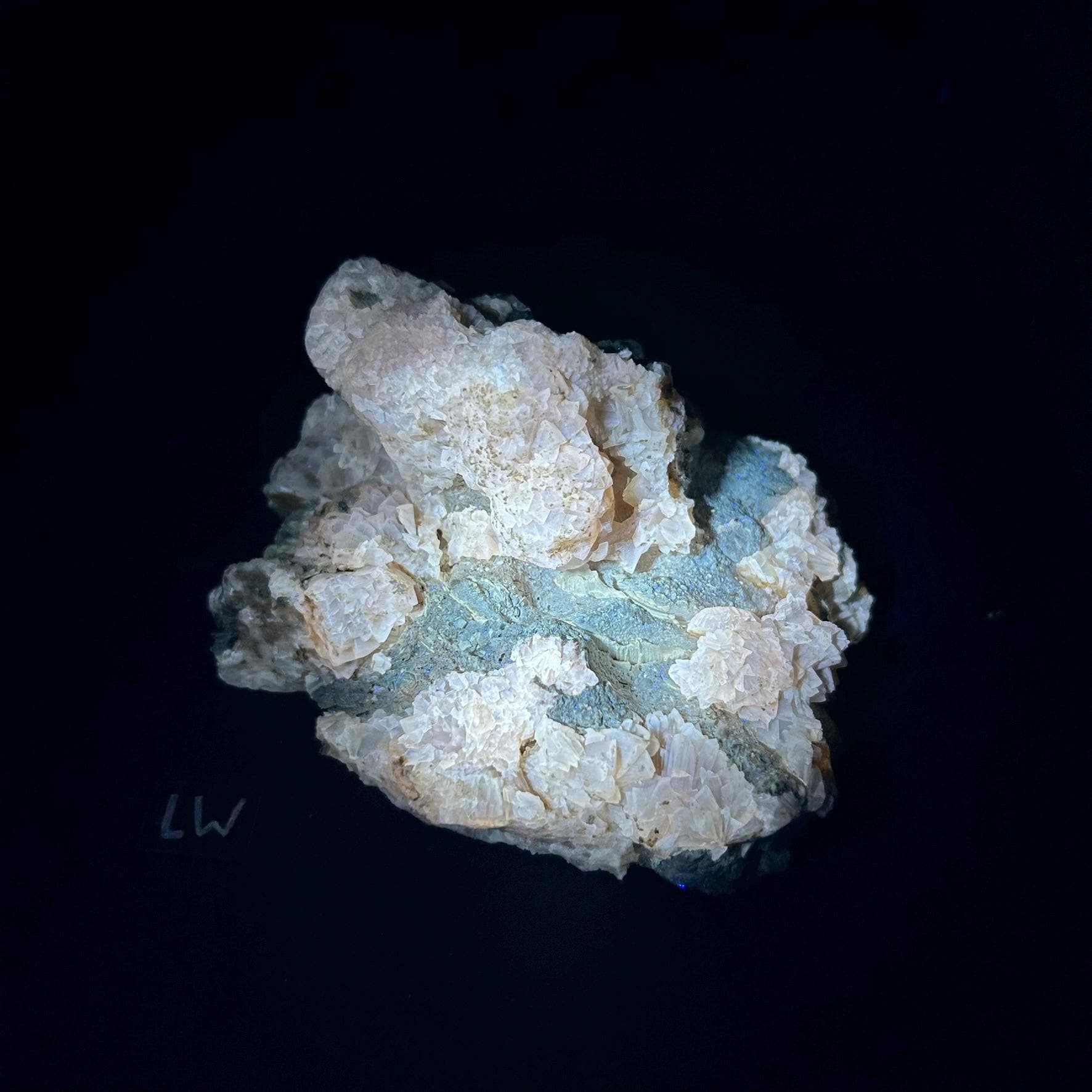A filtered shortwave uv light (sw 254nm), a midwave (mw 310nm), or a longwave (lw 365nm) uv light is necessary to see the fluorescence in this specimen.