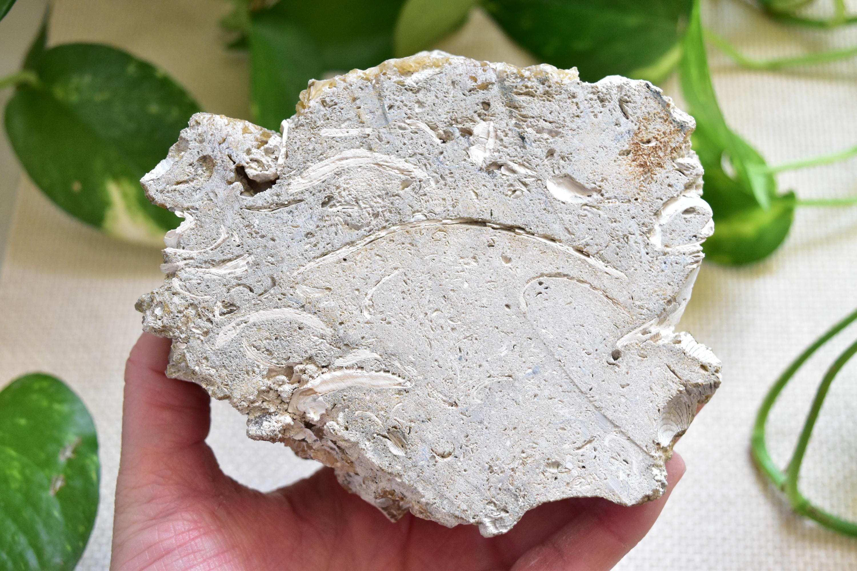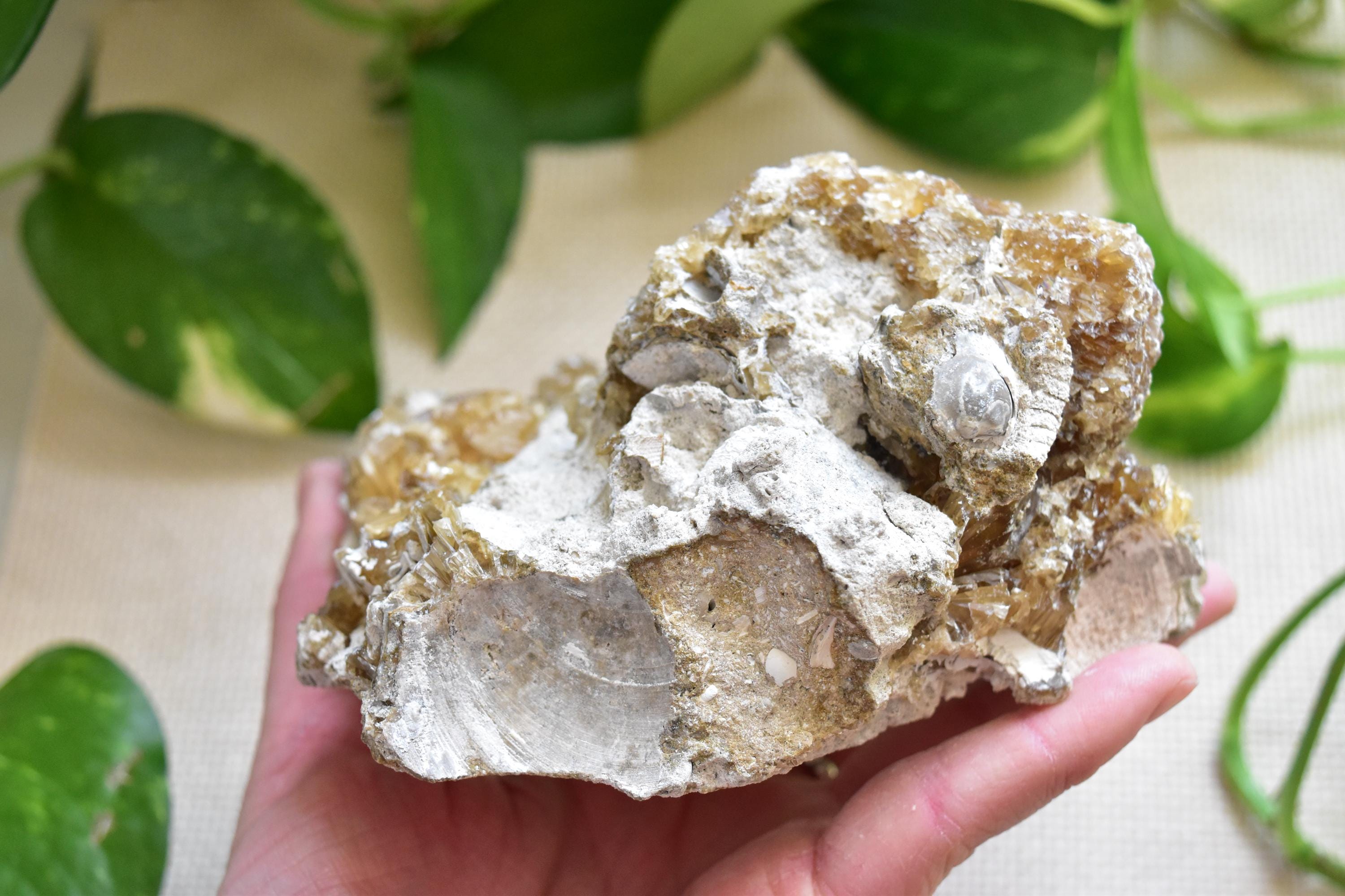 This mineral specimen from Florida features fluorescent and phosphorescent calcite with unique fossilized clams and shells. It fluoresces under all 3 uv wavelengths shortwave, longwave, midwave).