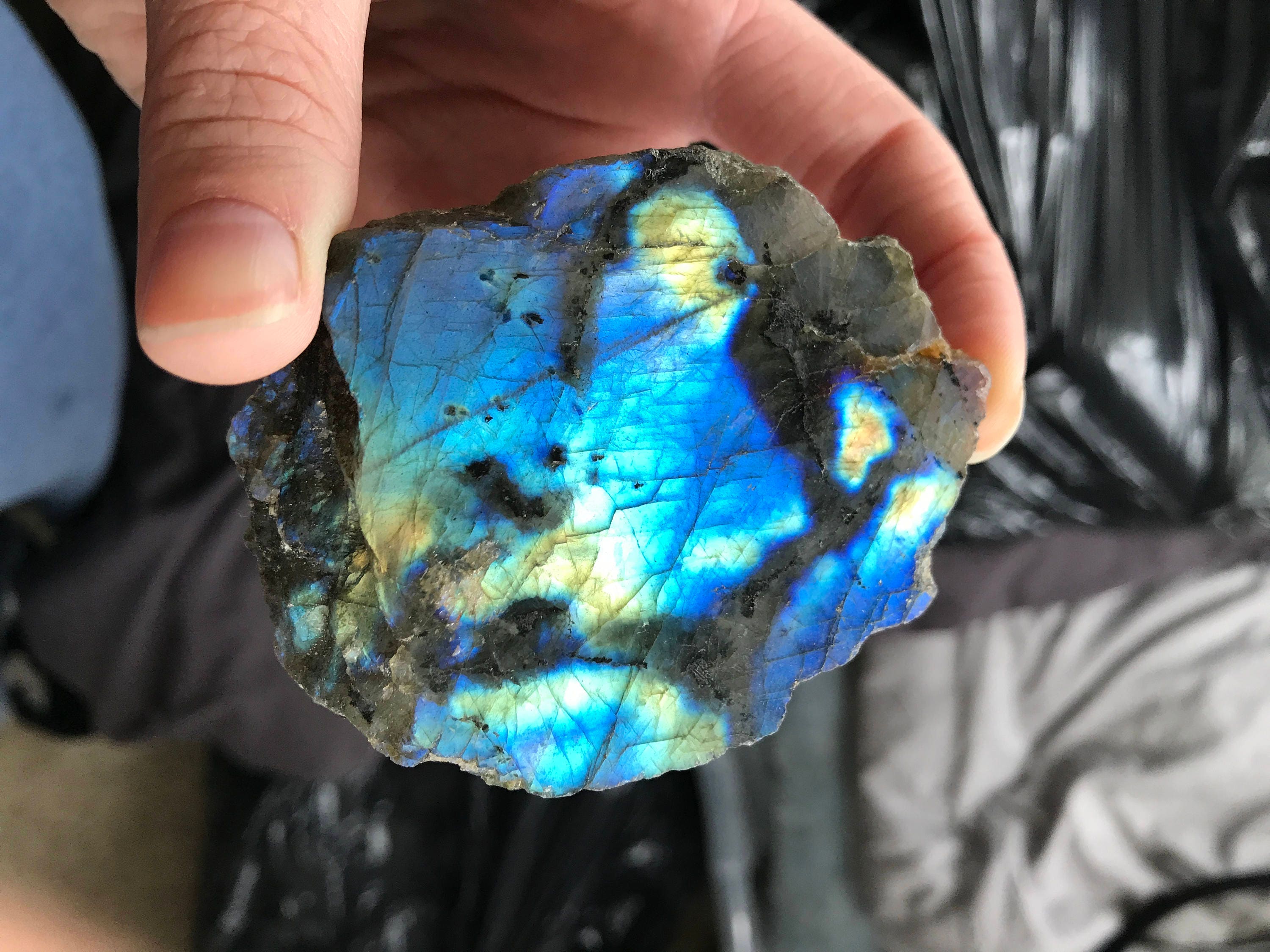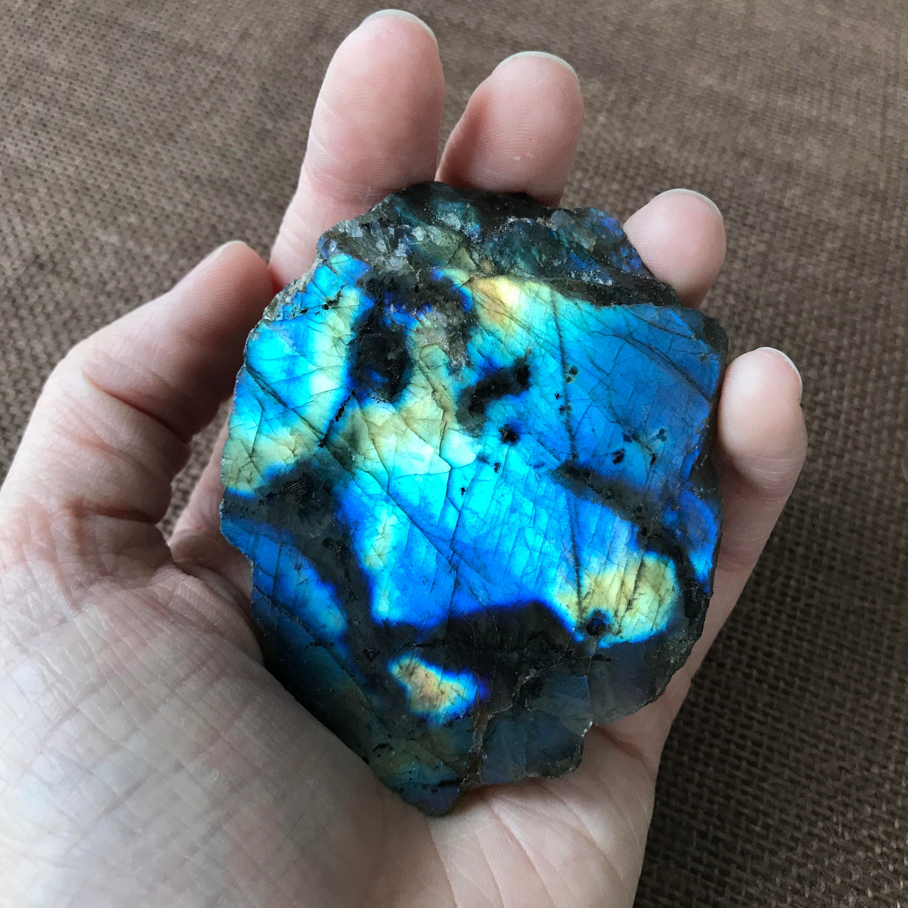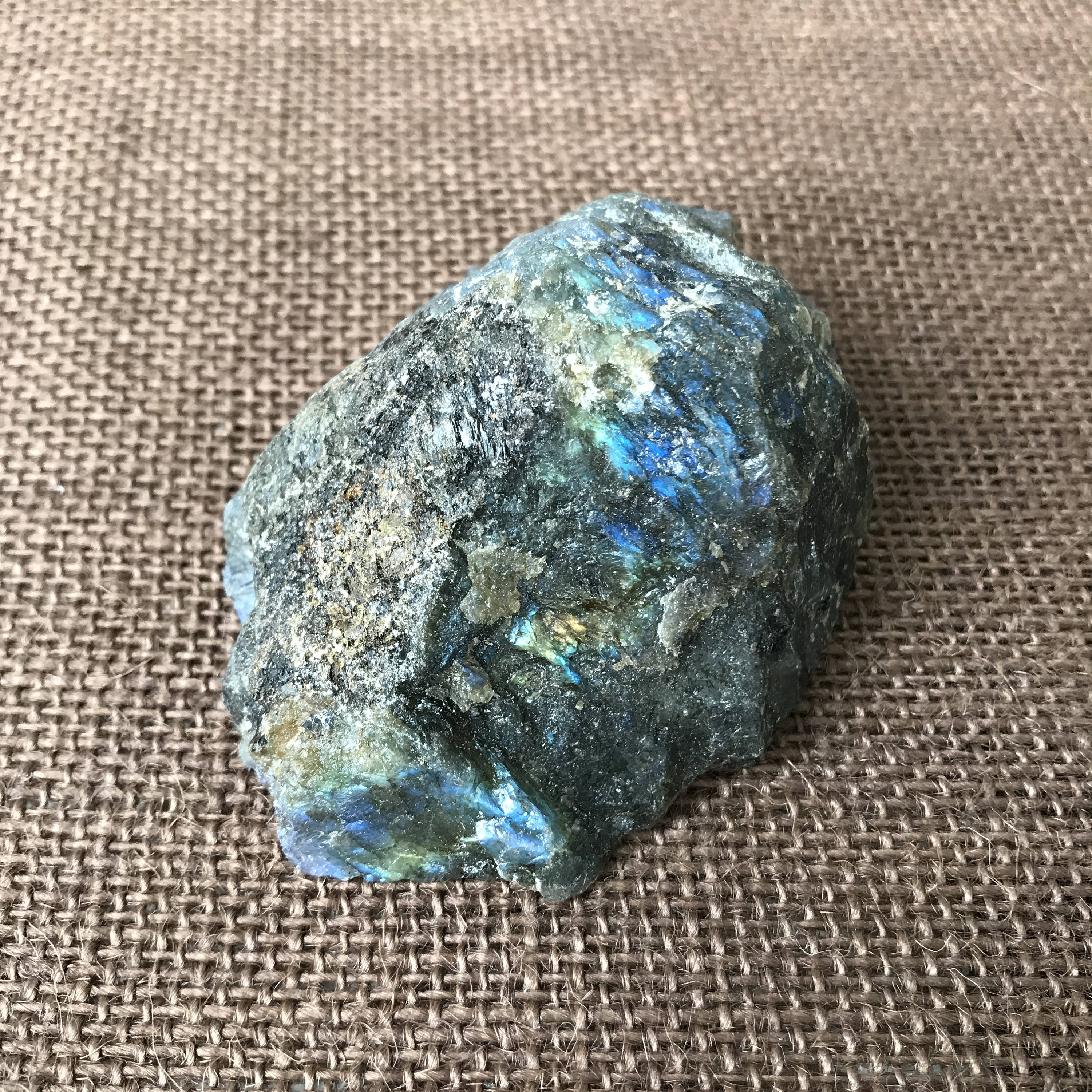 This beautiful piece of raw labradorite is polished in one side, and is unpolished in the back. Its very bright and beautiful on both sides.