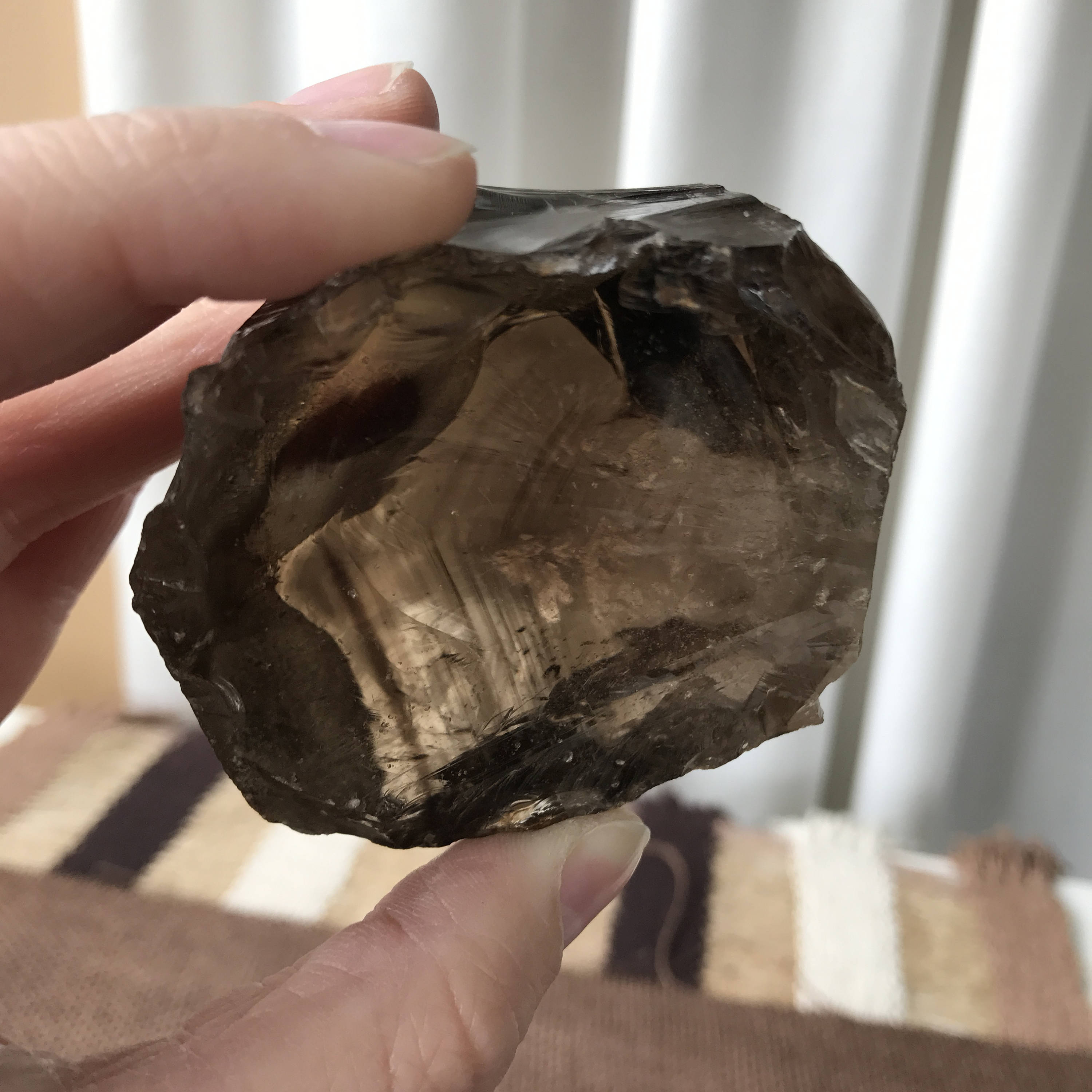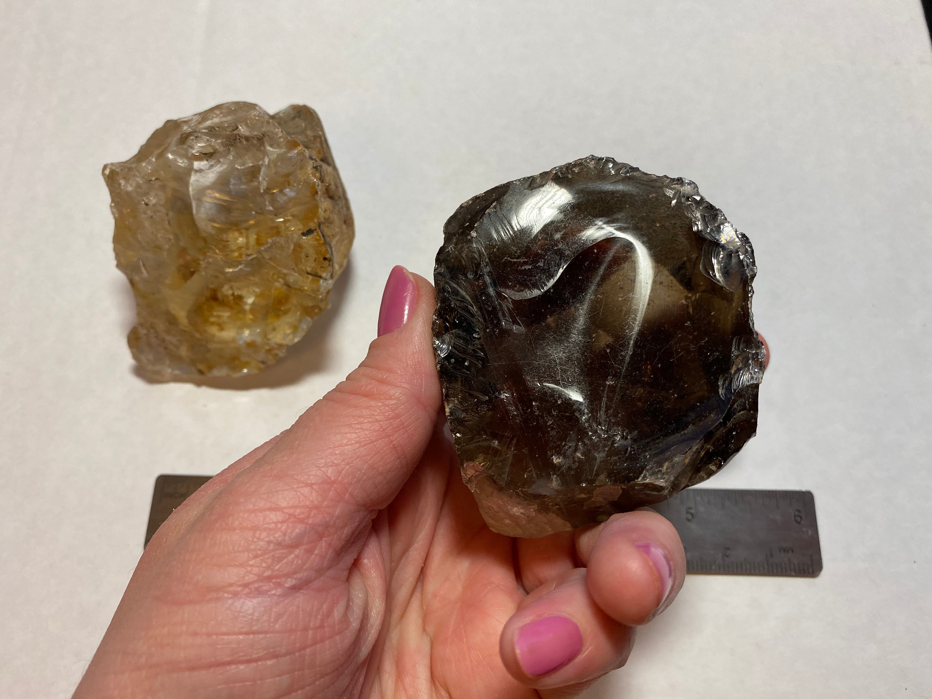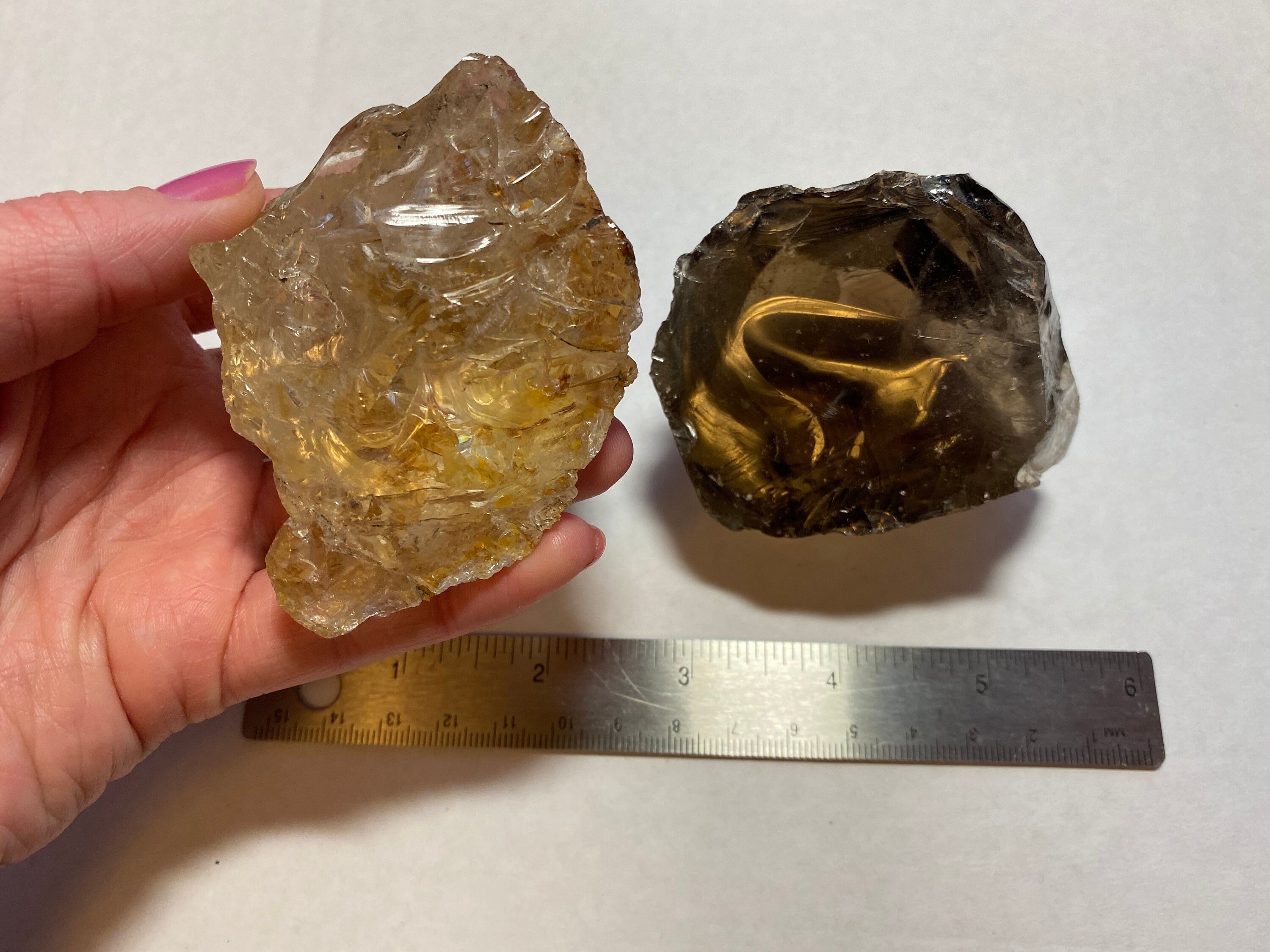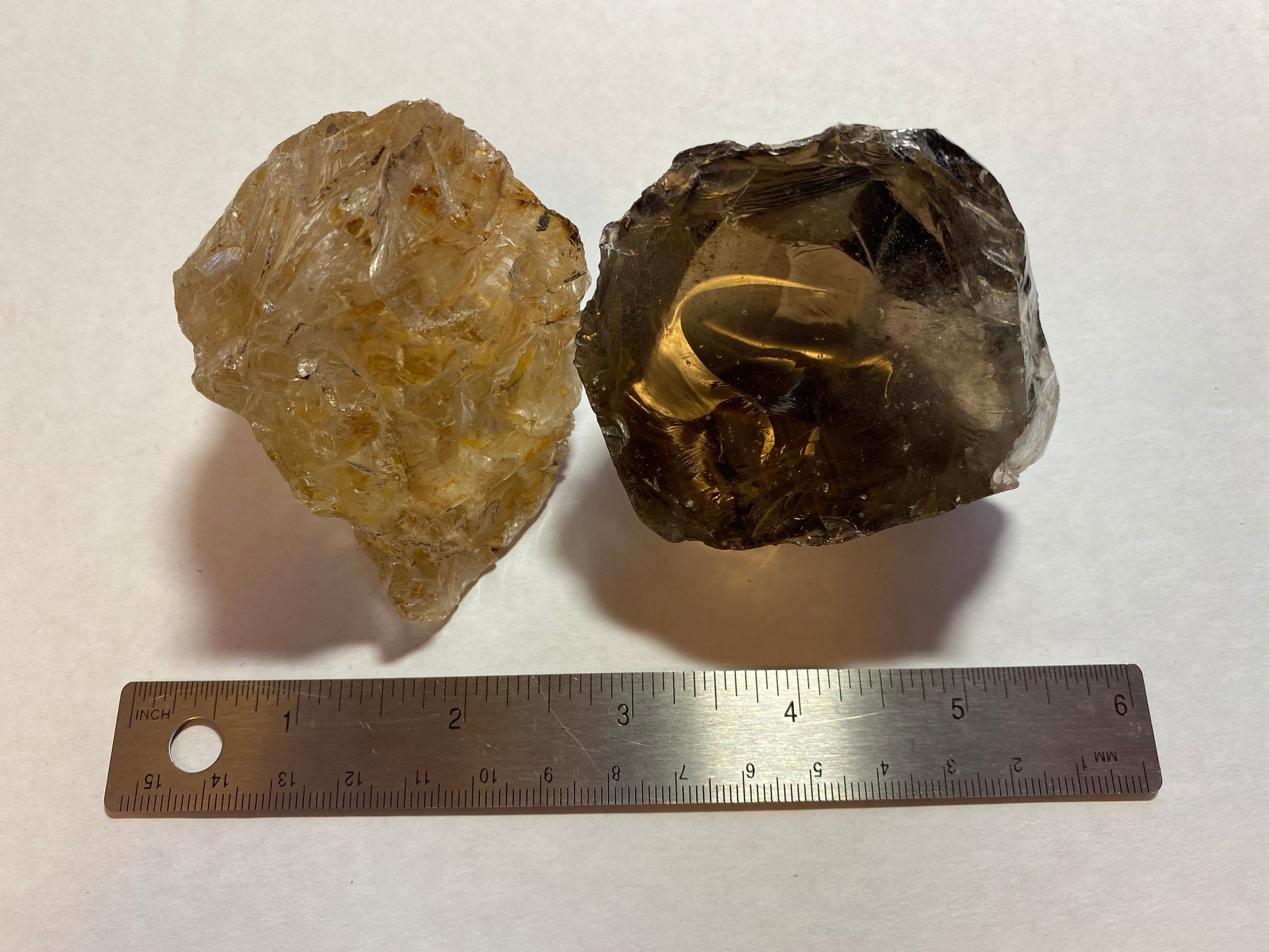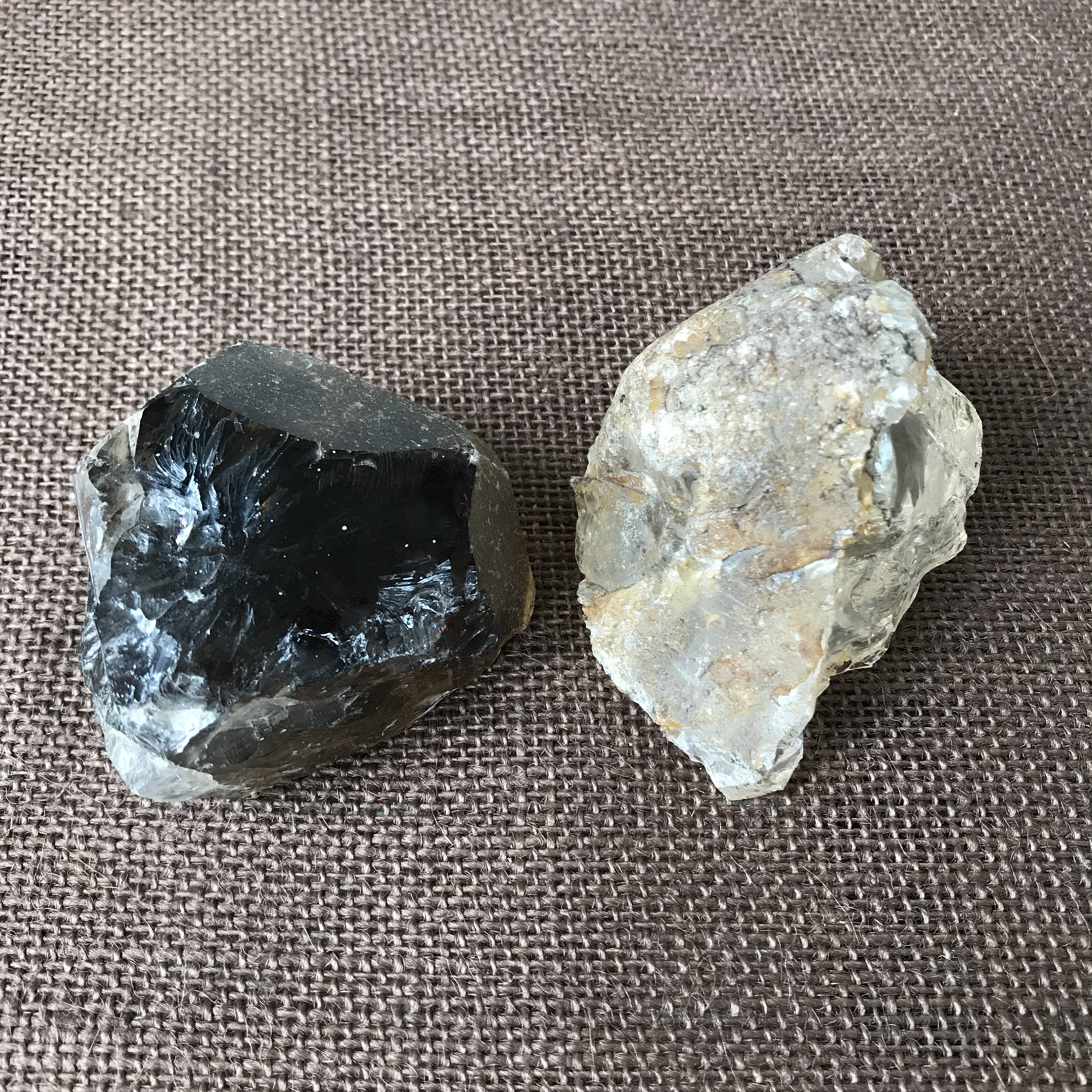 This set includes 1 raw chunk of smokey quartz, and 1 raw chunk of clear quartz. Both crystals come from Brazil. The clear quartz chunk has some beautiful rainbows. The smokey quartz is a piece that broke off of a big crystal point.