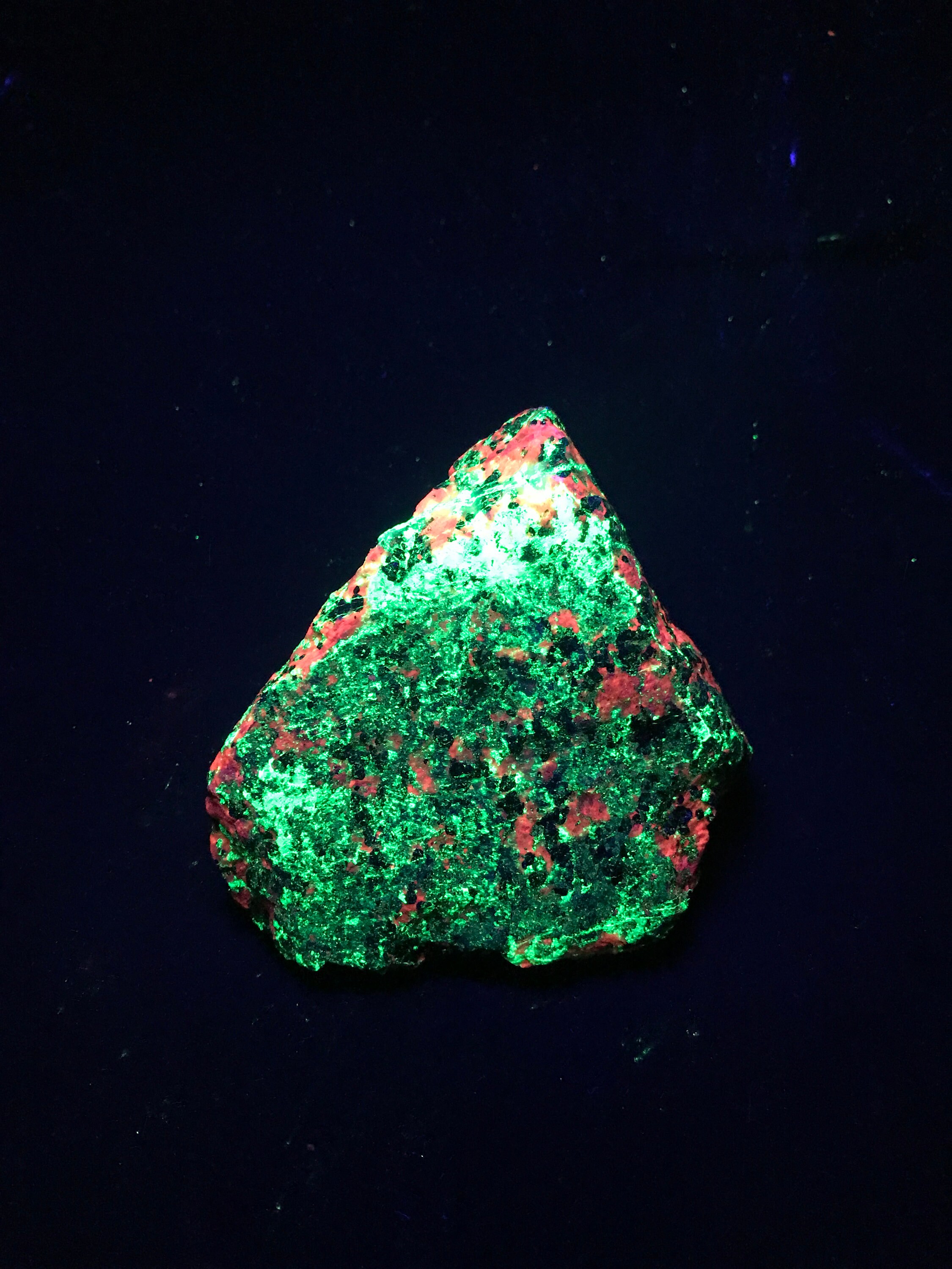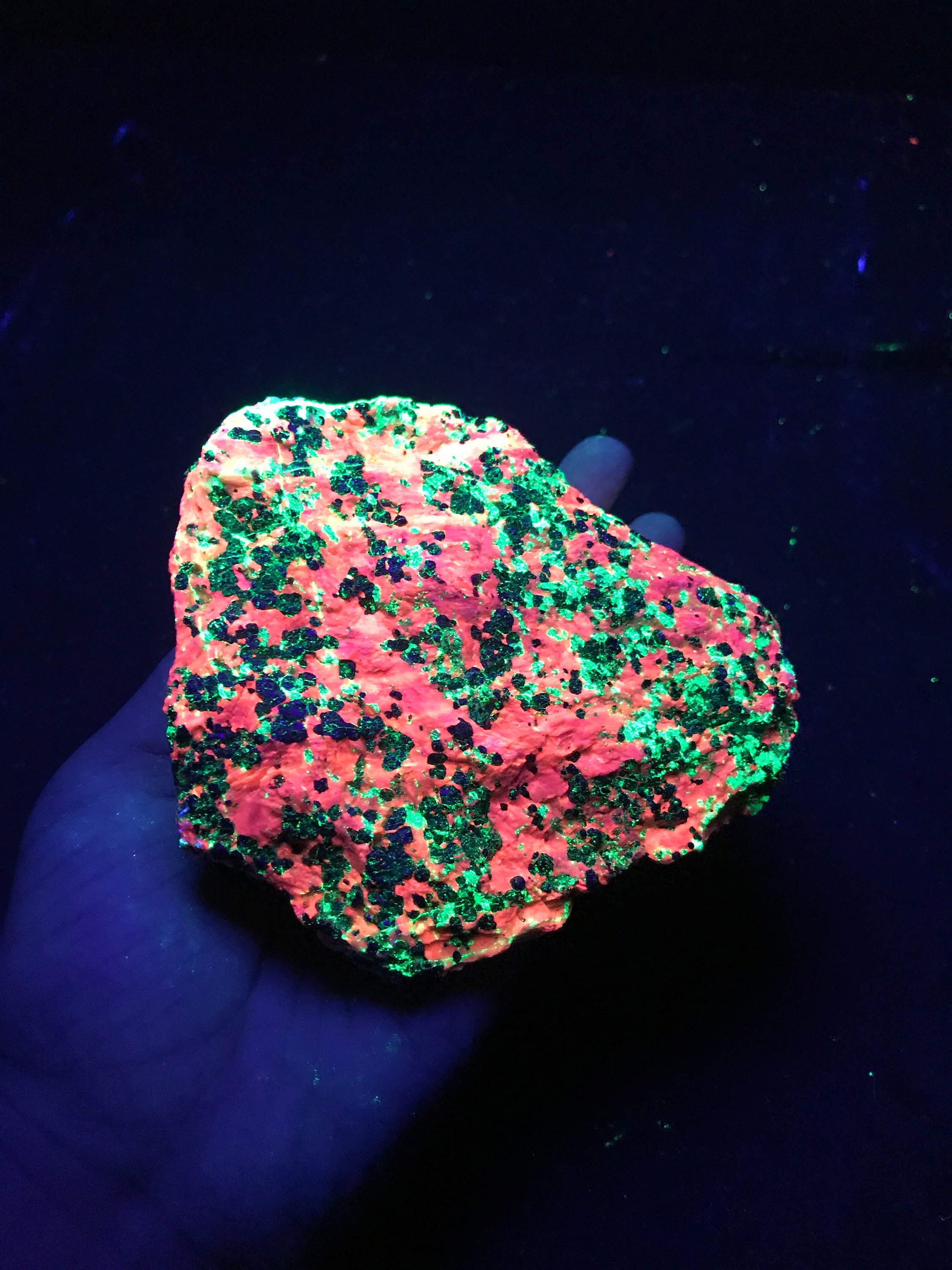 This specimen was photographed using a 36 watt shortwave ultraviolet lamp. The pictures have not been retouched.